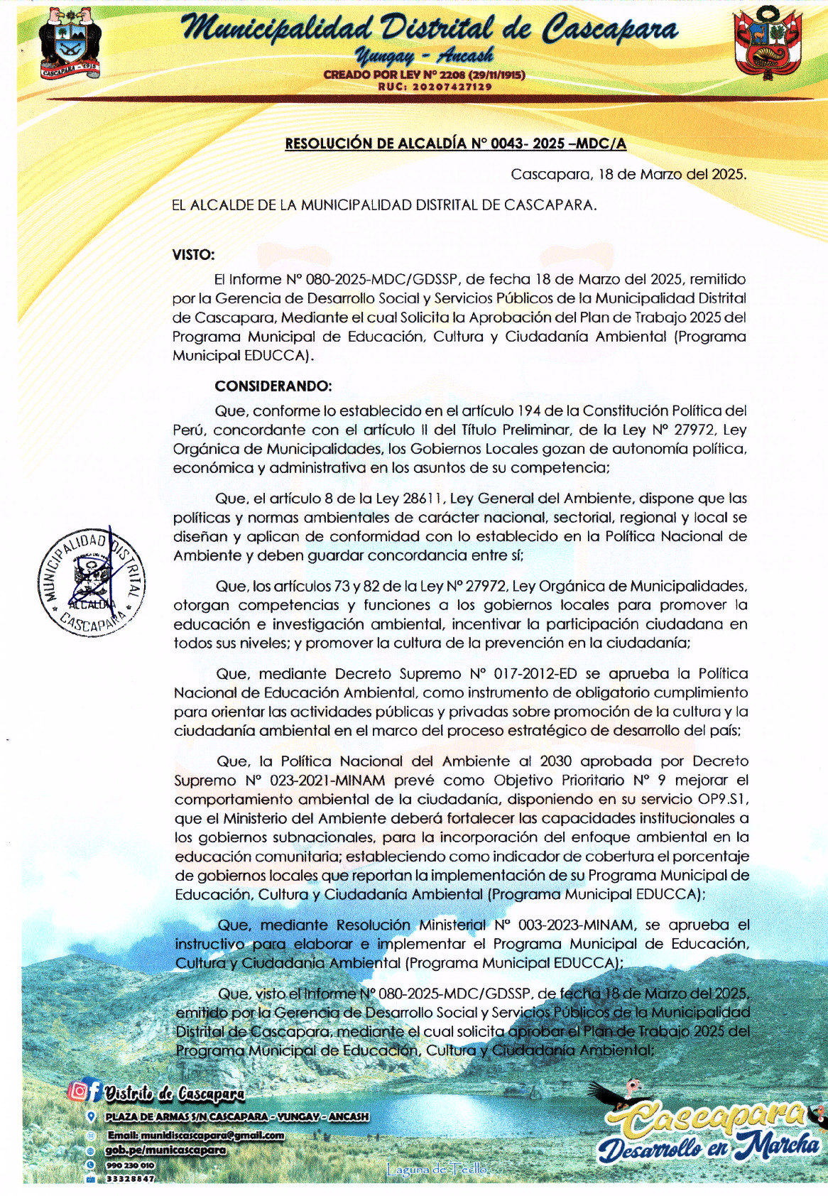 La presente Resolución de Alcaldía aprueba el Plan de Trabajo 2025 del Programa Municipal de Educación, Cultura y Ciudadanía Ambiental de la Municipalidad Distrital de Cascapara - Yungay (Áncash), con la finalidad de definir las actividades de educación, cultura y ciudadanía ambiental que se desarrollaran en la localidad durante el presente año.