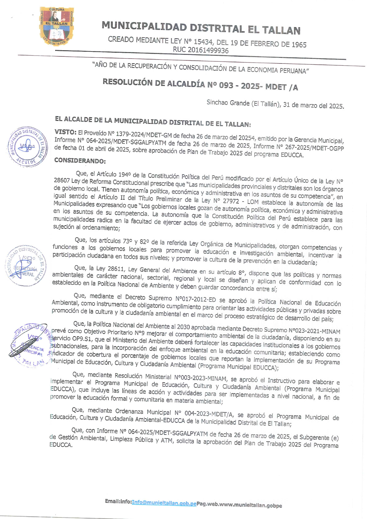 La presente Resolución de Alcaldía aprueba el Plan de Trabajo 2025 del Programa Municipal de Educación, Cultura y Ciudadanía Ambiental de la Municipalidad Distrital de El Tallán - Piura (Piura), con la finalidad de definir las actividades de educación, cultura y ciudadanía ambiental que se desarrollaran en la localidad durante el presente año.