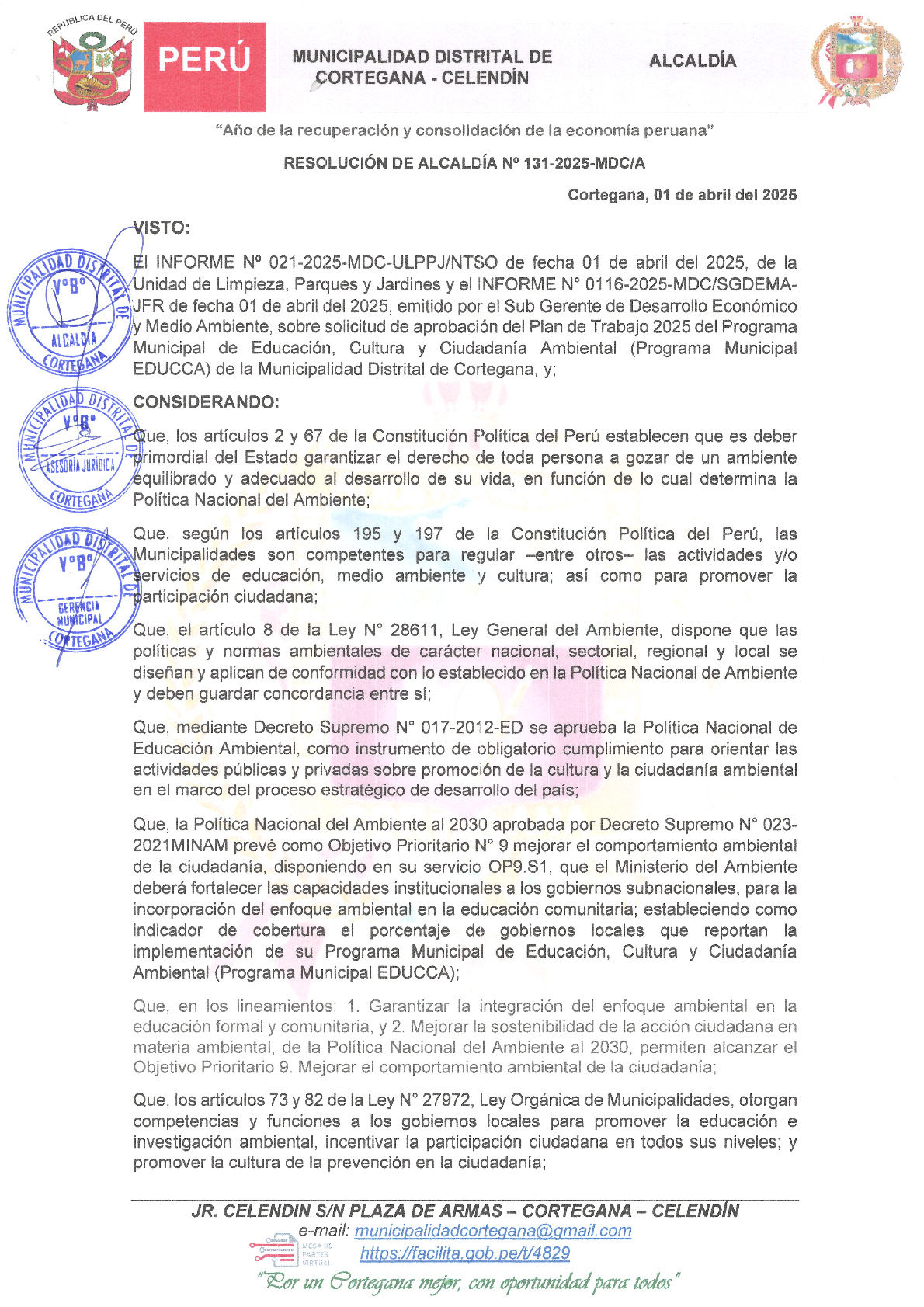 La presente Resolución de Alcaldía aprueba el Plan de Trabajo 2025 del Programa Municipal de Educación, Cultura y Ciudadanía Ambiental de la Municipalidad Distrital de Cortegana -Celendín (Cajamarca), con la finalidad de definir las actividades de educación, cultura y ciudadanía ambiental que se desarrollaran en la localidad durante el presente año.