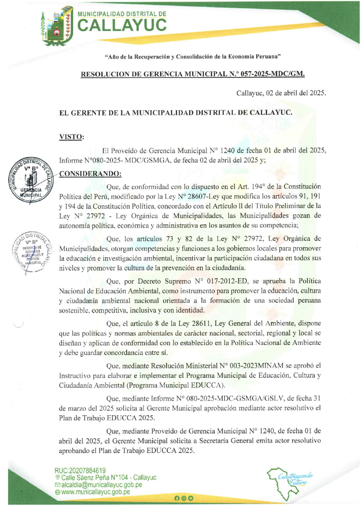 La presente Resolución de Gerencia Municipal aprueba el Plan de Trabajo 2025 del Programa Municipal de Educación, Cultura y Ciudadanía Ambiental de la Municipalidad Distrital de Callayuc - Cutervo (Cajamarca), con la finalidad de definir las actividades de educación, cultura y ciudadanía ambiental que se desarrollaran en la localidad durante el presente año.