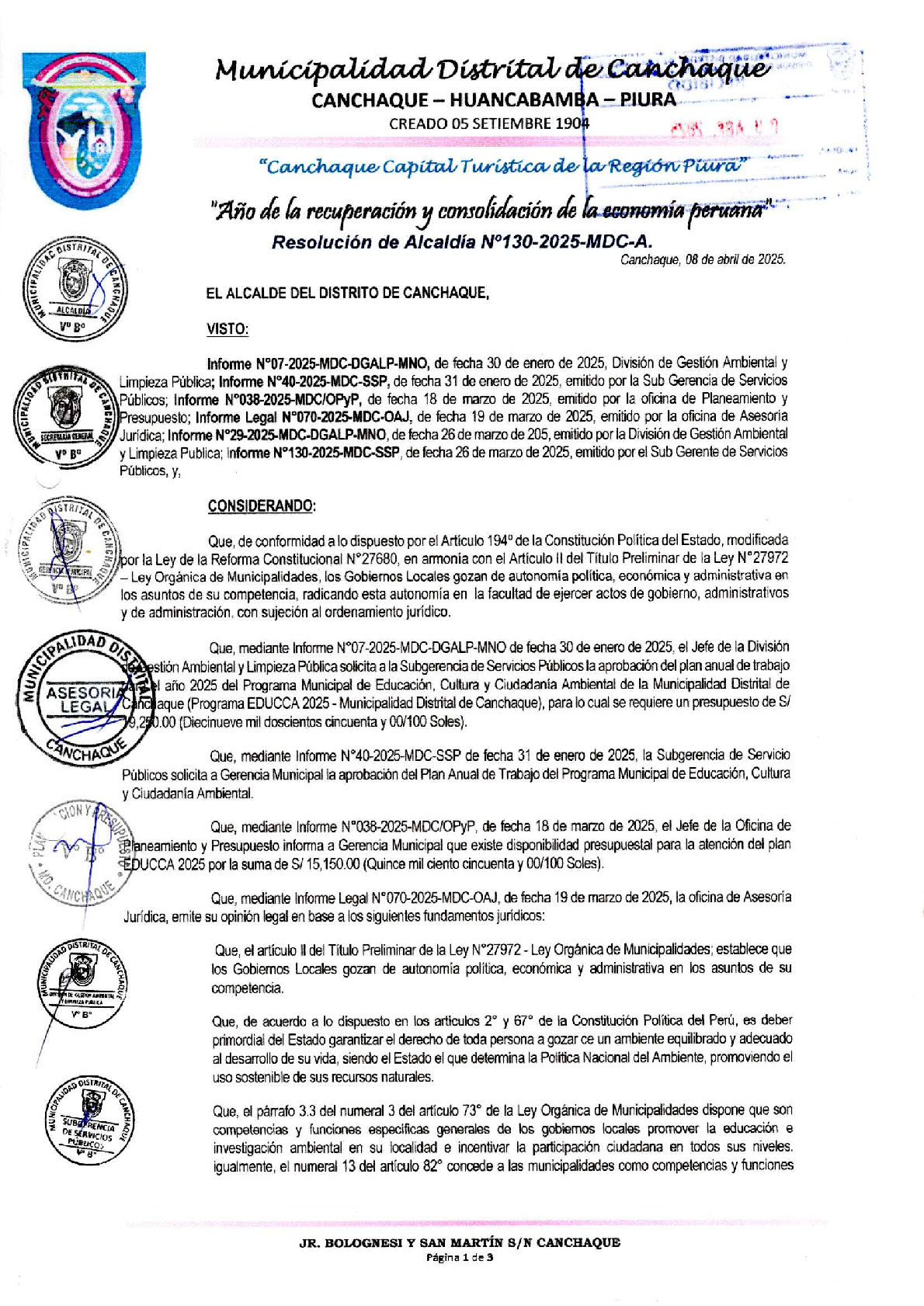 La presente Resolución de Alcaldía aprueba el Plan de Trabajo 2025 del Programa Municipal de Educación, Cultura y Ciudadanía Ambiental de la Municipalidad Distrital de Canchaque -Huancabamba (Piura), con la finalidad de definir las actividades de educación, cultura y ciudadanía ambiental que se desarrollaran en la localidad durante el presente año.
