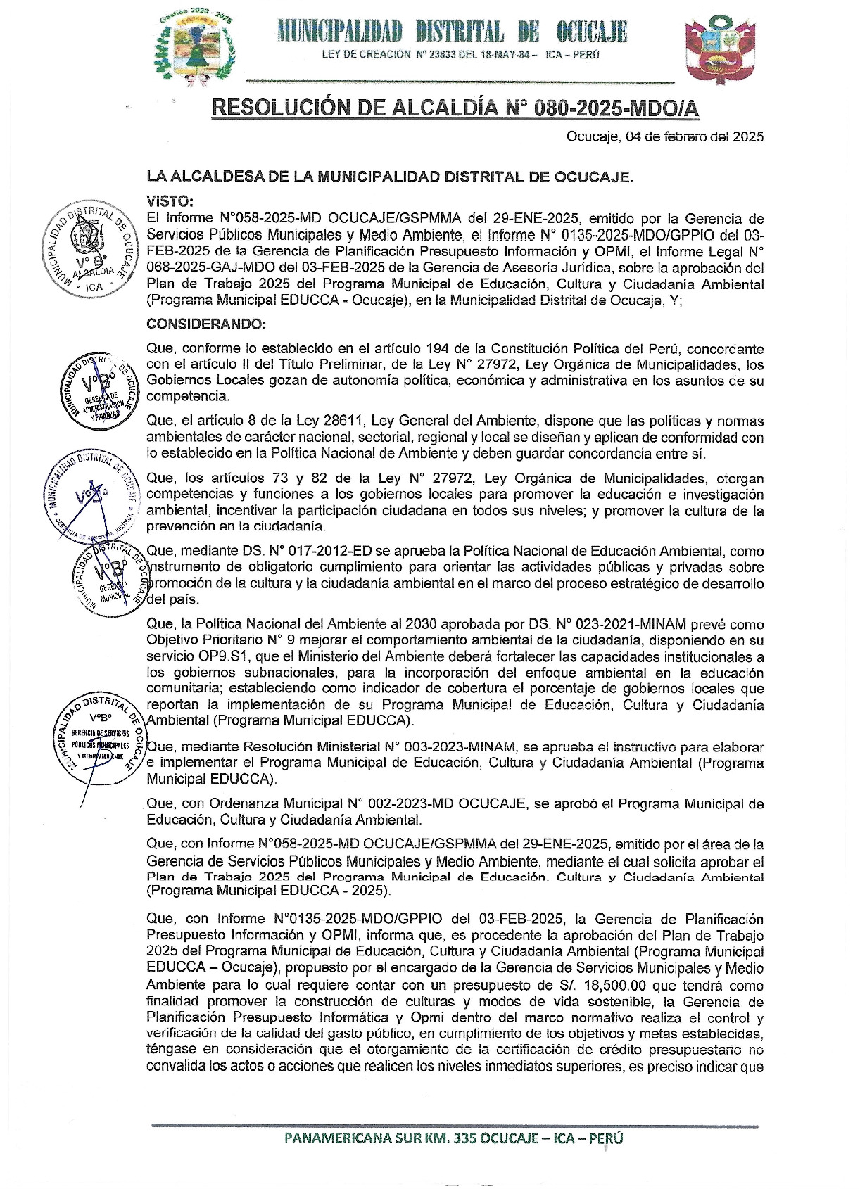 La presente Resolución de Alcaldía aprueba el Plan de Trabajo 2025 del Programa Municipal de Educación, Cultura y Ciudadanía Ambiental de la Municipalidad Distrital de Ocucaje - Ica (Ica), con la finalidad de definir las actividades de educación, cultura y ciudadanía ambiental que se desarrollaran en la localidad durante el presente año.
