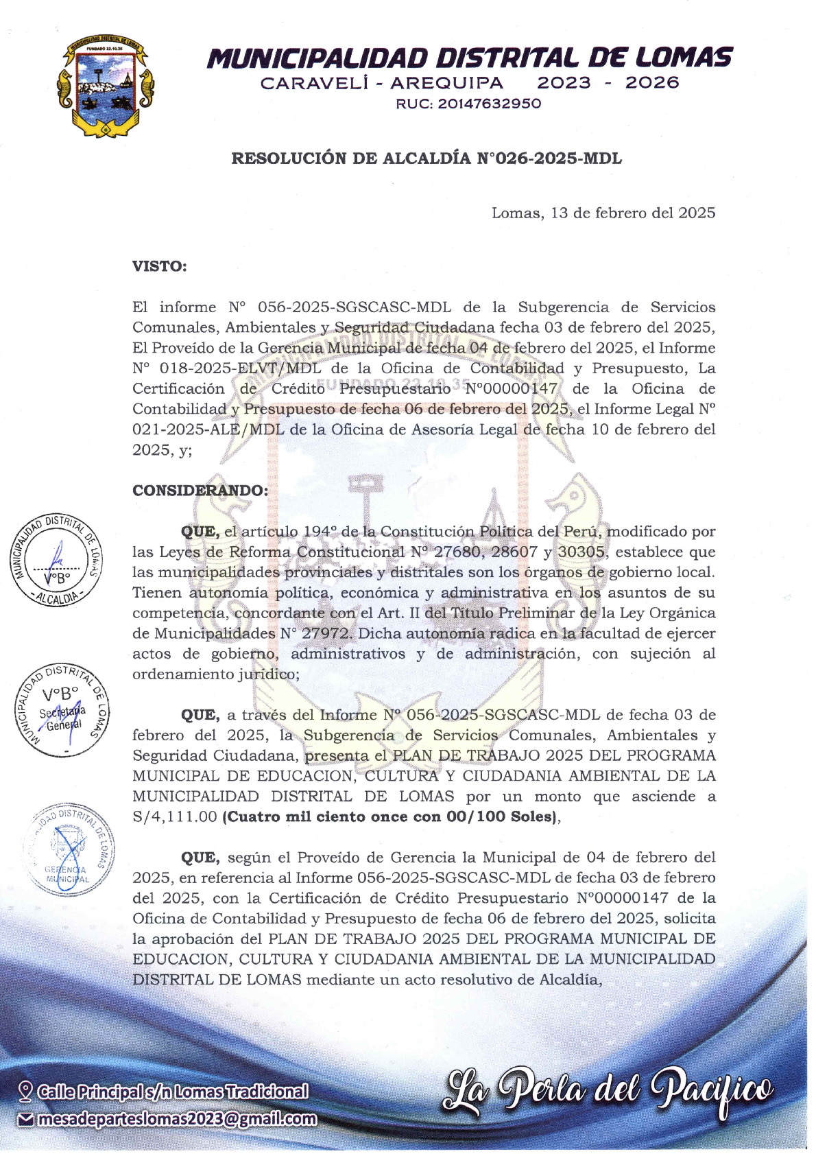 La presente Resolución de Alcaldía aprueba el Plan de Trabajo 2025 del Programa Municipal de Educación, Cultura y Ciudadanía Ambiental de la Municipalidad Distrital de Lomas -Caravelí (Arequipa), con la finalidad de definir las actividades de educación, cultura y ciudadanía ambiental que se desarrollaran en la localidad durante el presente año.