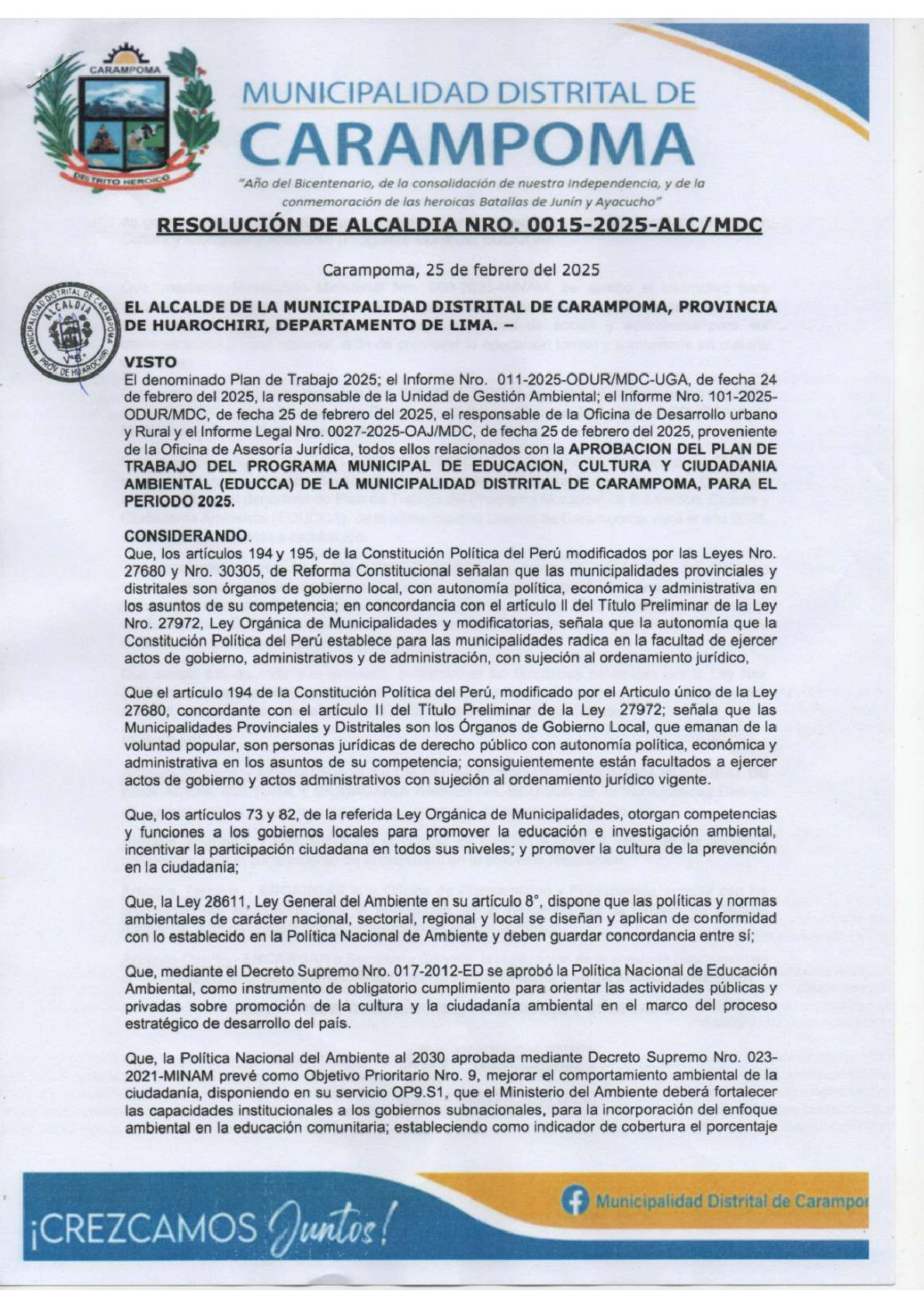La presente Resolución de Alcaldía aprueba el Plan de Trabajo 2025 del Programa Municipal de Educación, Cultura y Ciudadanía Ambiental de la Municipalidad Distrital de Carampoma - Huarochirí (Lima), con la finalidad de definir las actividades de educación, cultura y ciudadanía ambiental que se desarrollaran en la localidad durante el presente año.