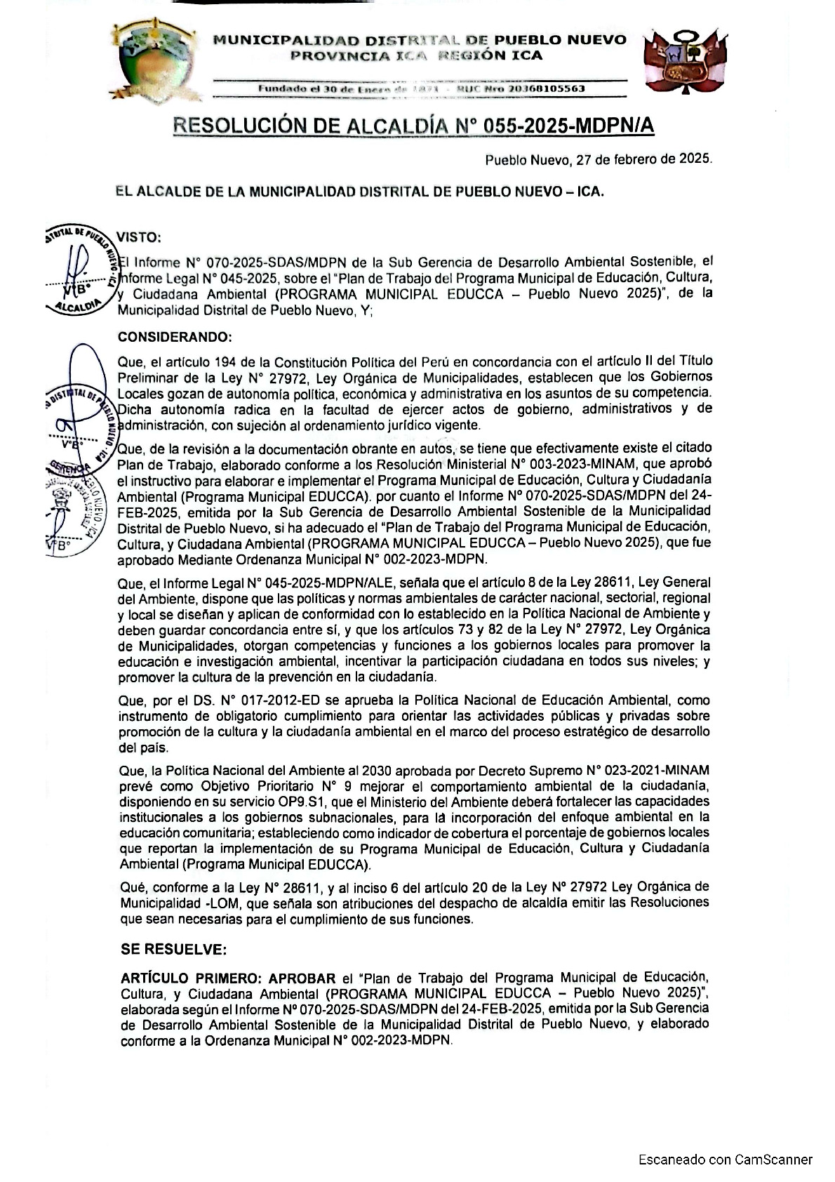 La presente Resolución de Alcaldía aprueba el Plan de Trabajo 2025 del Programa Municipal de Educación, Cultura y Ciudadanía Ambiental de la Municipalidad Distrital de Pueblo Nuevo - Ica (Ica), con la finalidad de definir las actividades de educación, cultura y ciudadanía ambiental que se desarrollaran en la localidad durante el presente año.