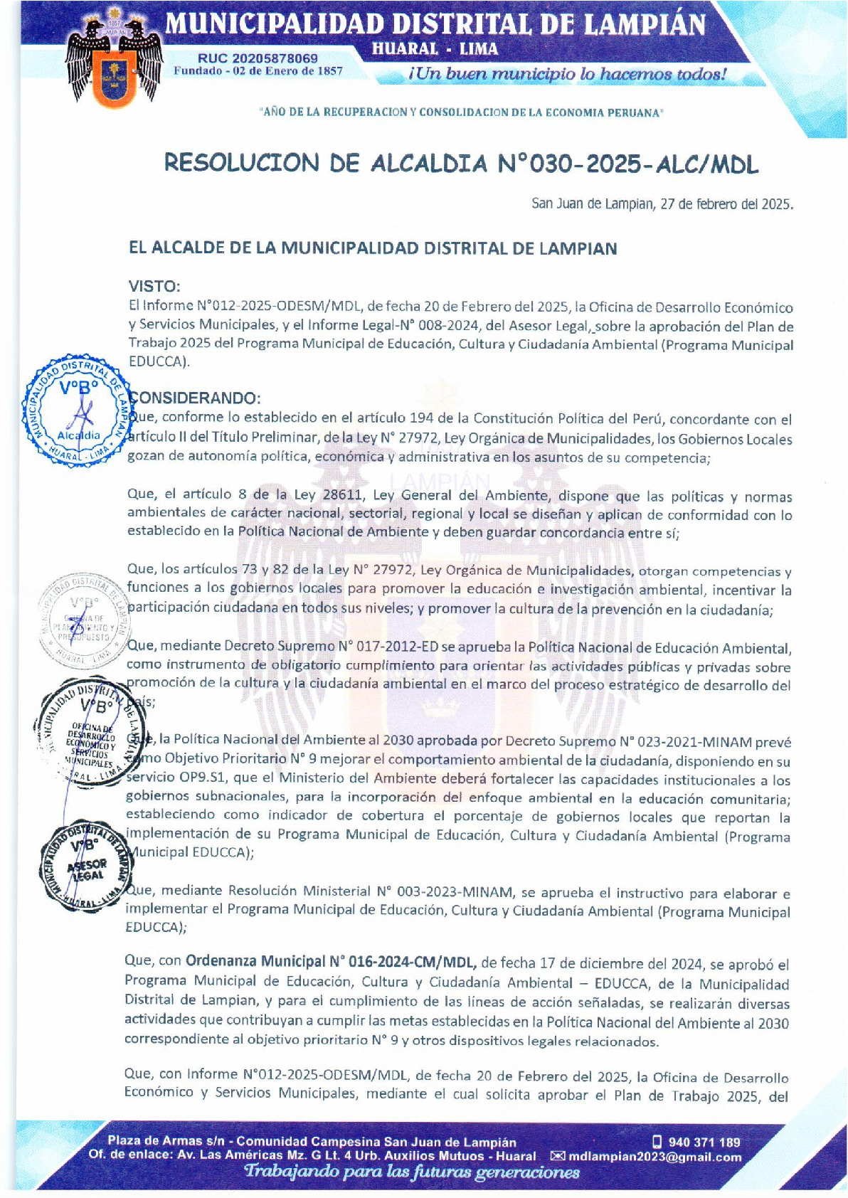 La presente Resolución de Alcaldía aprueba el Plan de Trabajo 2025 del Programa Municipal de Educación, Cultura y Ciudadanía Ambiental de la Municipalidad Distrital de Lampián -Huaral (Lima), con la finalidad de definir las actividades de educación, cultura y ciudadanía ambiental que se desarrollaran en la localidad durante el presente año.
