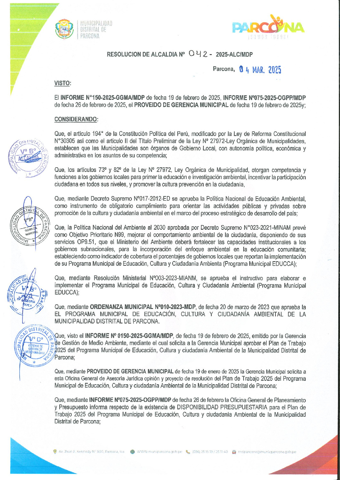 La presente Resolución de Alcaldía aprueba el Plan de Trabajo 2025 del Programa Municipal de Educación, Cultura y Ciudadanía Ambiental de la Municipalidad Distrital de Parcona - Ica (Ica), con la finalidad de definir las actividades de educación, cultura y ciudadanía ambiental que se desarrollaran en la localidad durante el presente año.