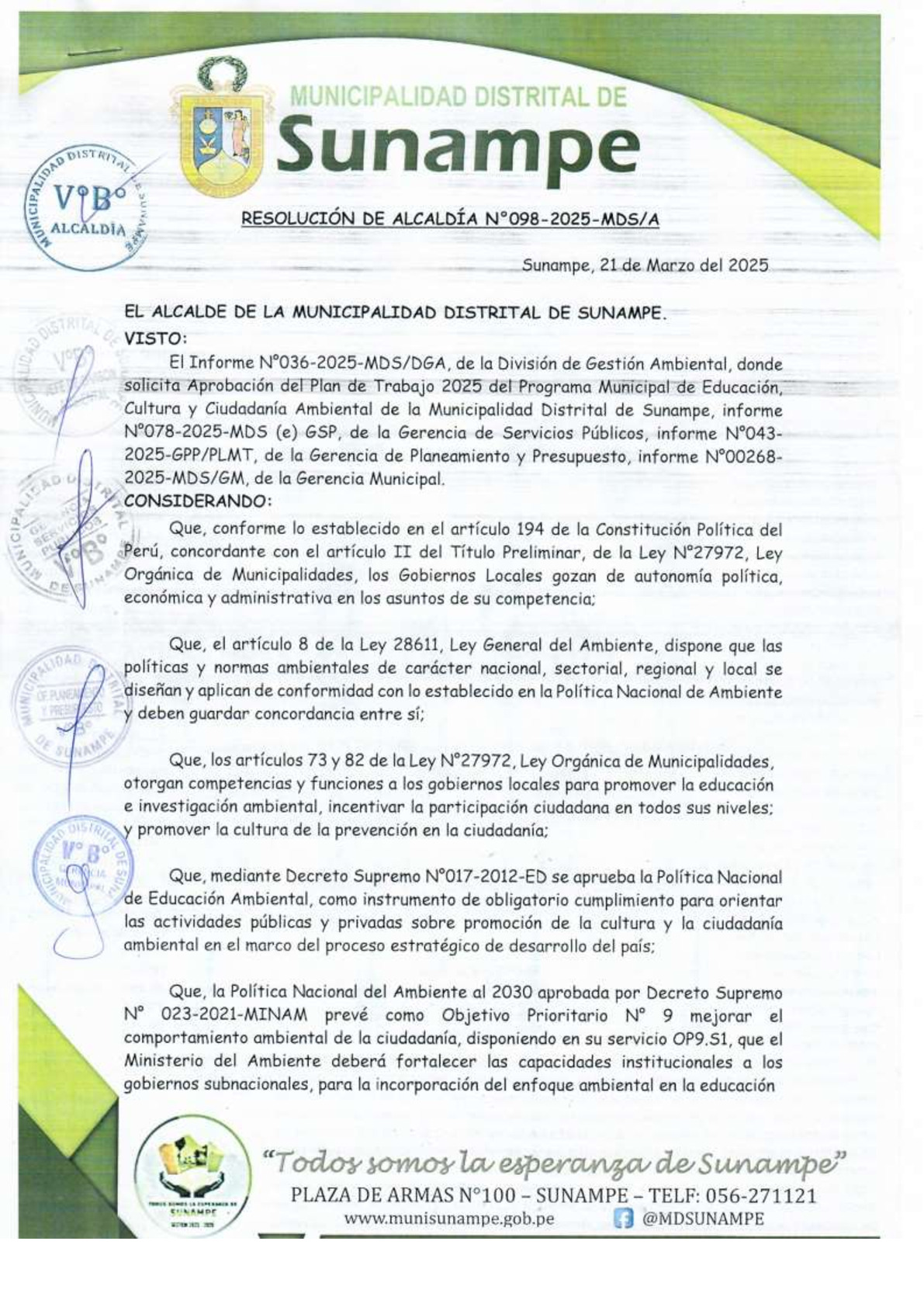 La presente Resolución de Alcaldía aprueba el Plan de Trabajo 2025 del Programa Municipal de Educación, Cultura y Ciudadanía Ambiental de la Municipalidad Distrital de Sunampe -Chincha (Ica), con la finalidad de definir las actividades de educación, cultura y ciudadanía ambiental que se desarrollaran en la localidad durante el presente año.