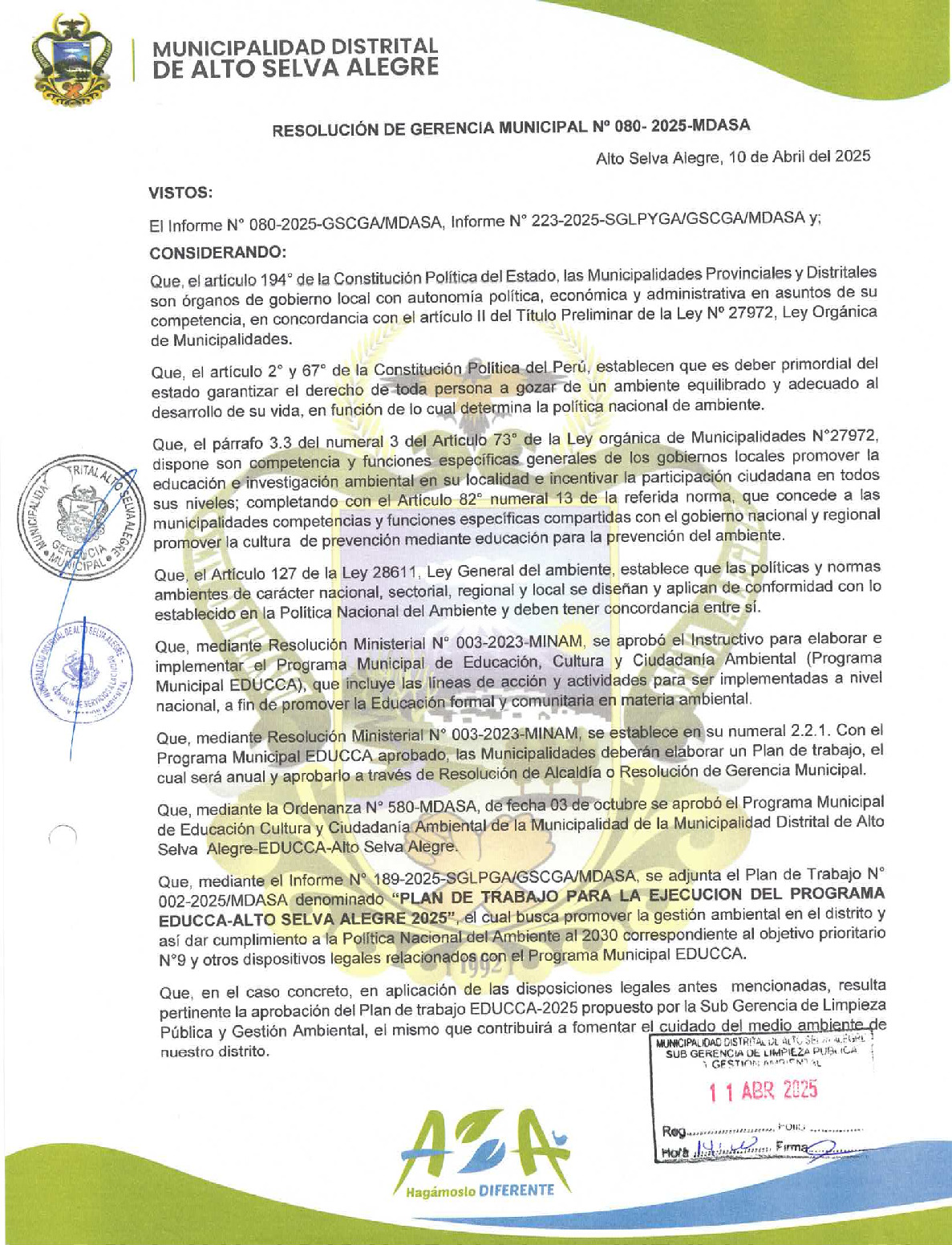 La presente Resolución de Gerencia Municipal aprueba el Plan de Trabajo 2025 del Programa Municipal de Educación, Cultura y Ciudadanía Ambiental de la Municipalidad Distrital de Alto Selva Alegre - Arequipa (Arequipa), con la finalidad de definir las actividades de educación, cultura y ciudadanía ambiental que se desarrollaran en la localidad durante el presente año.