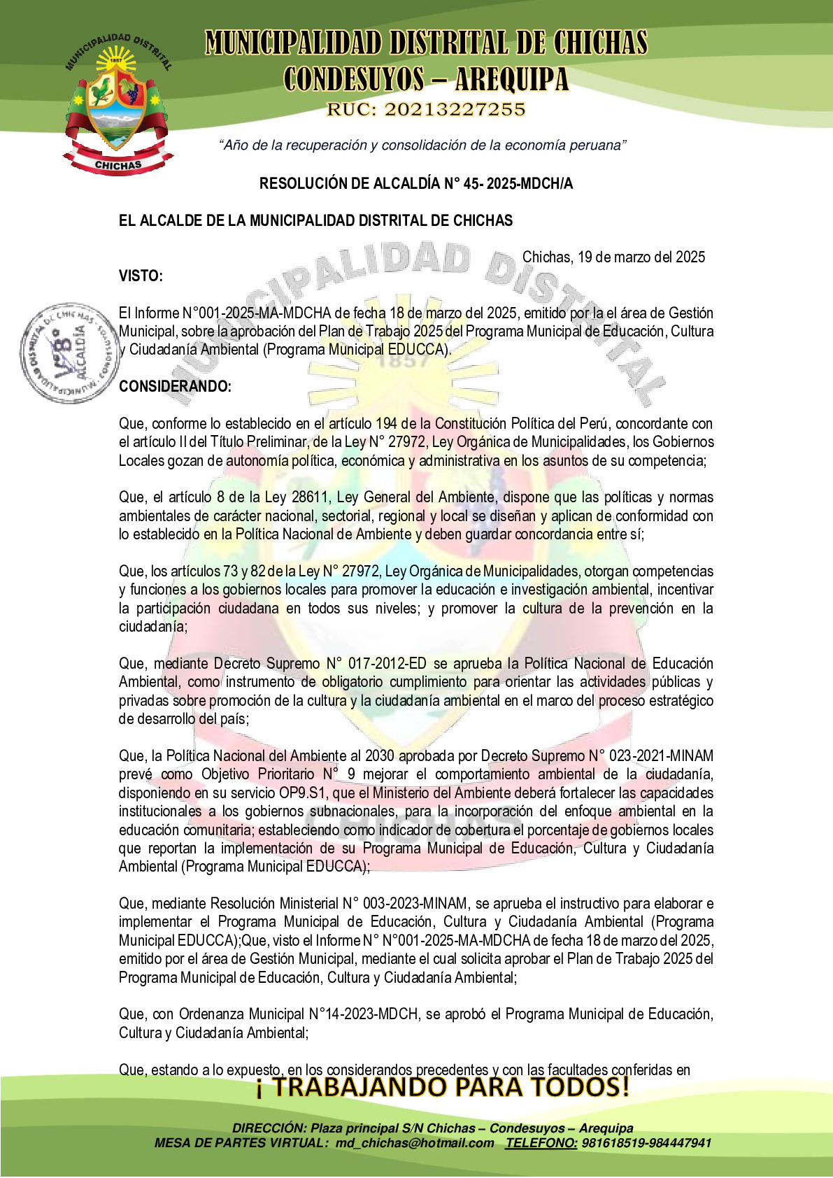 La presente Resolución de Gerencia Municipal aprueba el Plan de Trabajo 2025 del Programa Municipal de Educación, Cultura y Ciudadanía Ambiental de la Municipalidad Distrital de Chichas - Condesuyos (Arequipa), con la finalidad de definir las actividades de educación, cultura y ciudadanía ambiental que se desarrollaran en la localidad durante el presente año.