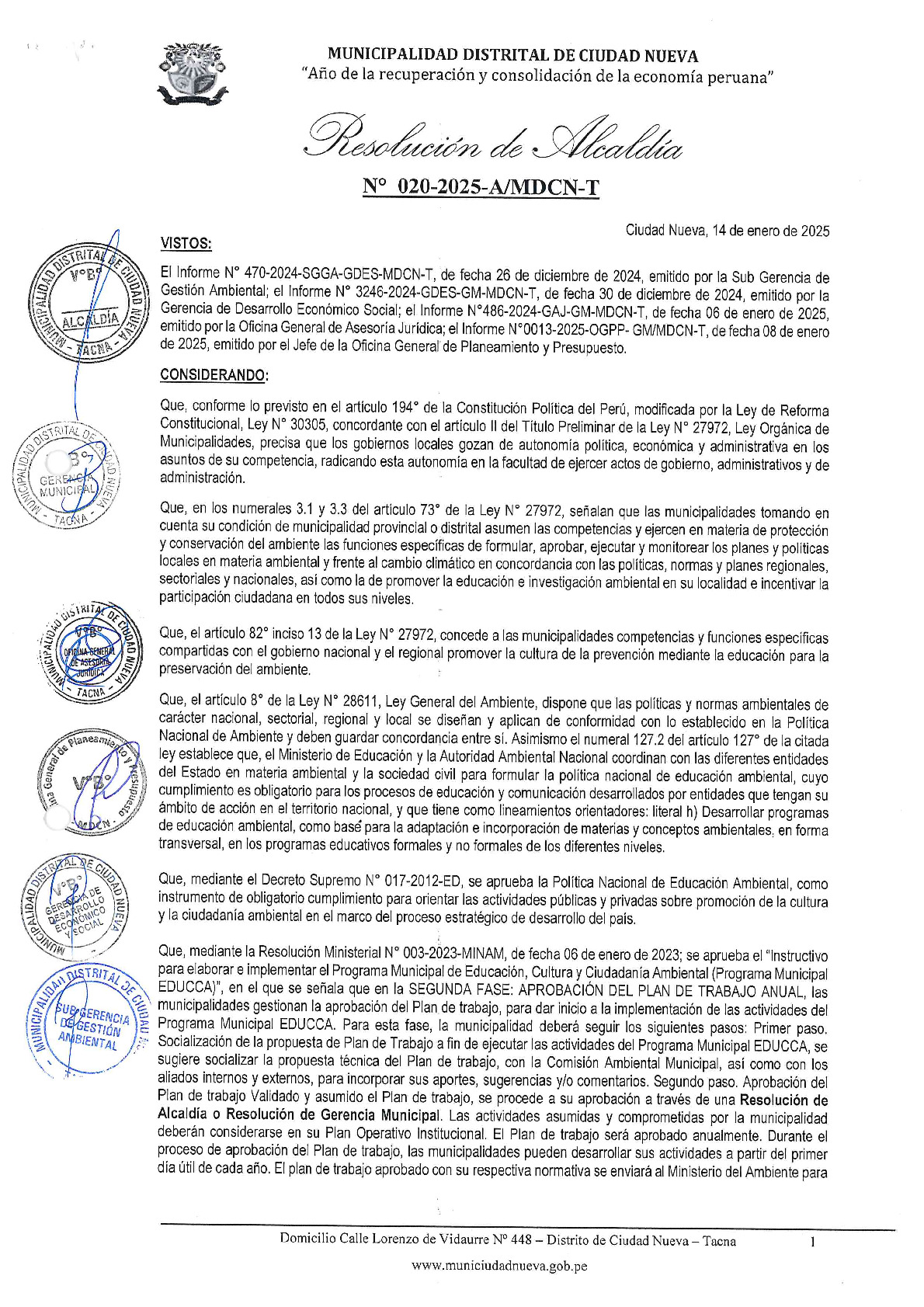 La presente Resolución de Alcaldía aprueba el Plan de Trabajo 2025 del Programa Municipal de Educación, Cultura y Ciudadanía Ambiental de la Municipalidad Distrital de Ciudad Nueva - Tacna (Tacna), con la finalidad de definir las actividades de educación, cultura y ciudadanía ambiental que se desarrollaran en la localidad durante el presente año.