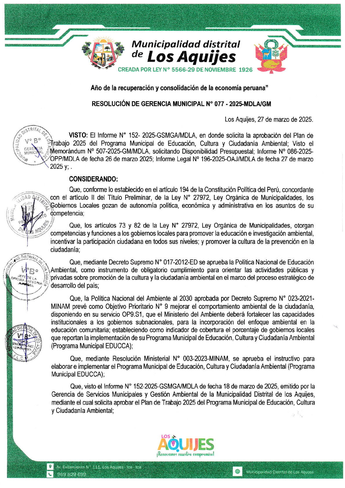 La presente Resolución de Gerencia Municipal aprueba el Plan de Trabajo 2025 del Programa Municipal de Educación, Cultura y Ciudadanía Ambiental de la Municipalidad Distrital de Los Aquijes - Ica (Ica), con la finalidad de definir las actividades de educación, cultura y ciudadanía ambiental que se desarrollaran en la localidad durante el presente año.