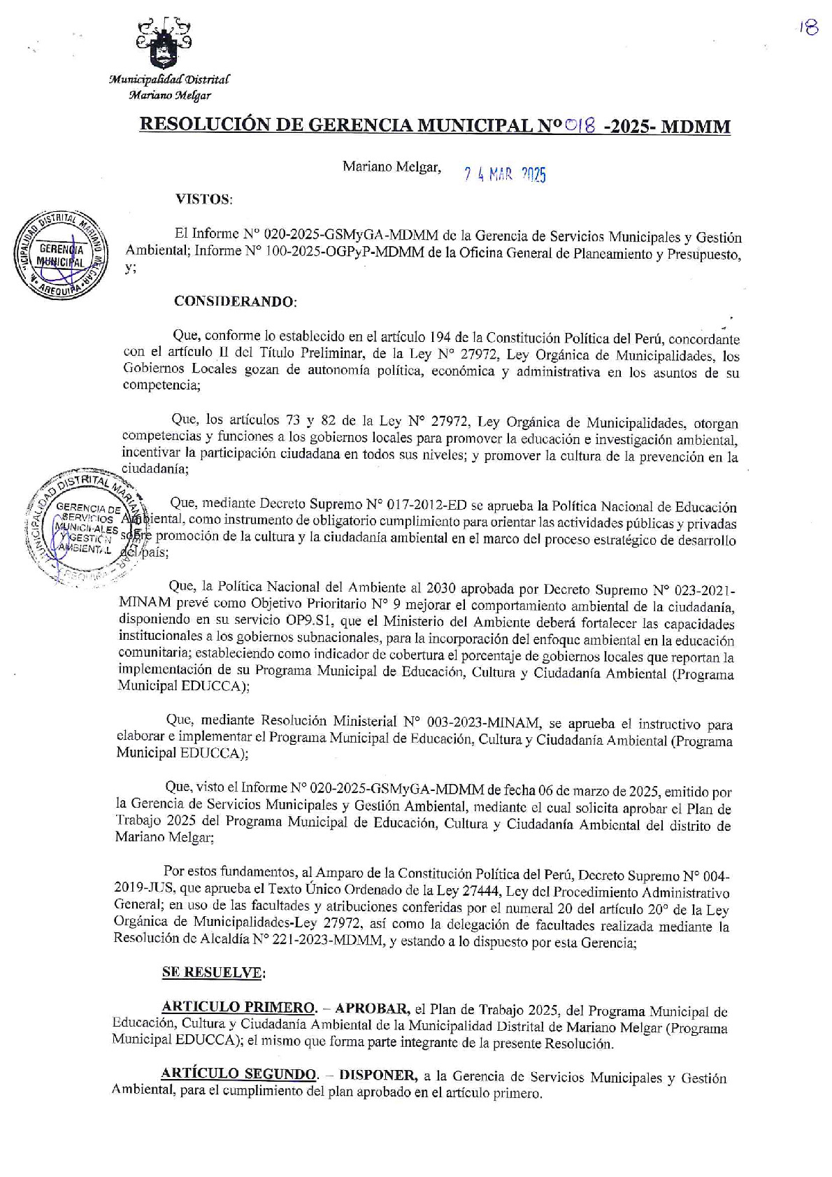 La presente Resolución de Gerencia Municipal aprueba el Plan de Trabajo 2025 del Programa Municipal de Educación, Cultura y Ciudadanía Ambiental de la Municipalidad Distrital de Mariano Melgar - Arequipa (Arequipa), con la finalidad de definir las actividades de educación, cultura y ciudadanía ambiental que se desarrollaran en la localidad durante el presente año.