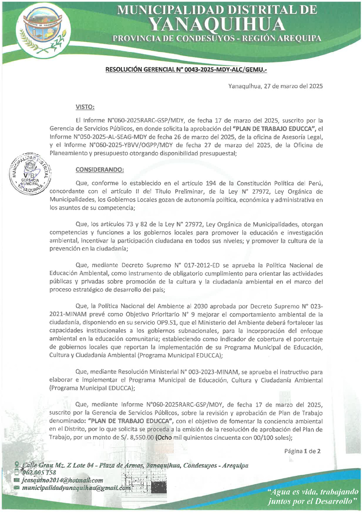 La presente Resolución de Gerencia Municipal aprueba el Plan de Trabajo 2025 del Programa Municipal de Educación, Cultura y Ciudadanía Ambiental de la Municipalidad Distrital de Yanaquihua - Condesuyos (Arequipa), con la finalidad de definir las actividades de educación, cultura y ciudadanía ambiental que se desarrollaran en la localidad durante el presente año.