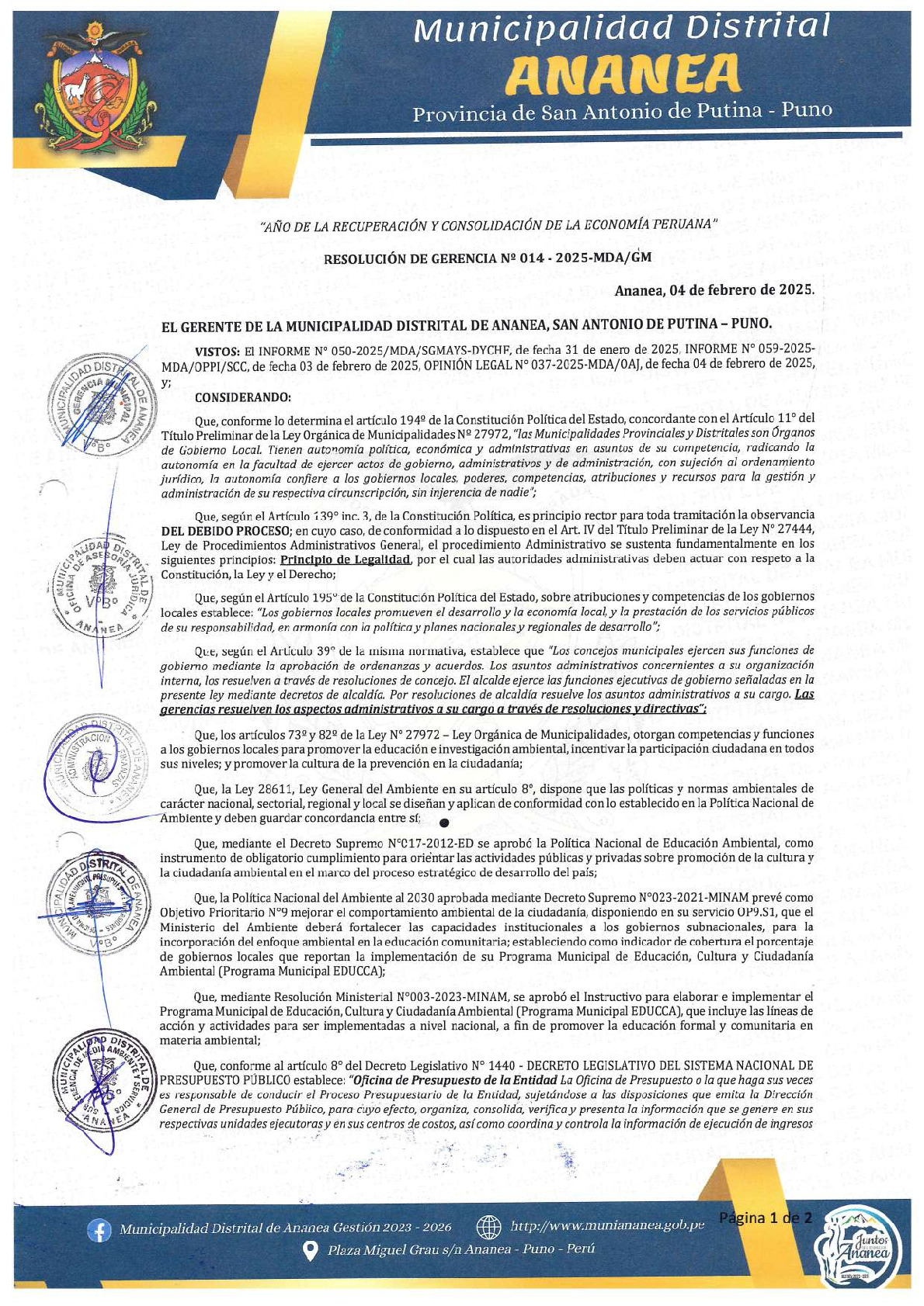 La presente Resolución de Gerencia Municipal aprueba el Plan de Trabajo 2025 del Programa Municipal de Educación, Cultura y Ciudadanía Ambiental de la Municipalidad Distrital de Ananea (Puno), con la finalidad de definir las actividades de educación, cultura y ciudadanía ambiental que se desarrollaran en la localidad durante el presente año.