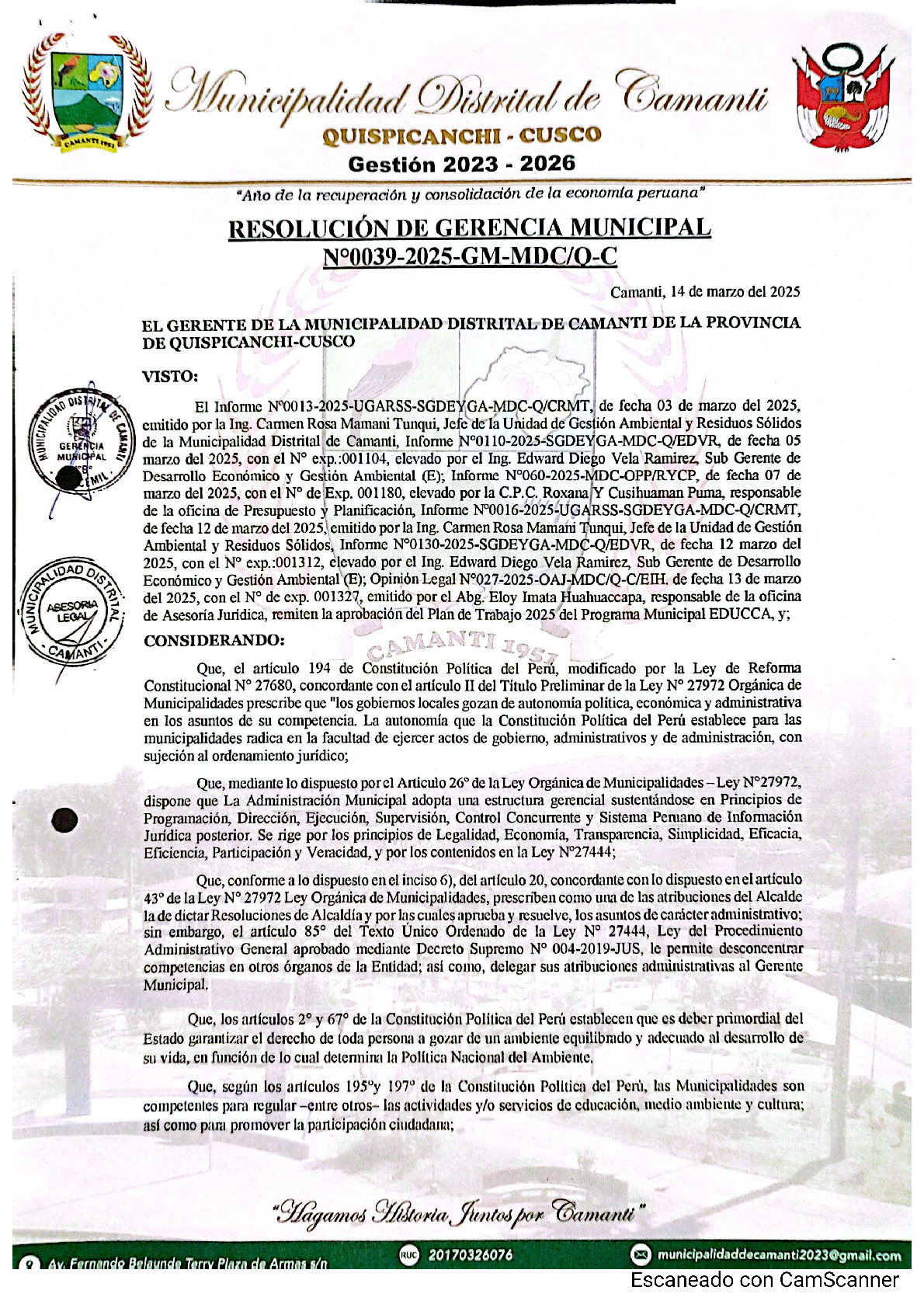 La presente Resolución de Gerencia Municipal aprueba el Plan de Trabajo 2025 del Programa Municipal de Educación, Cultura y Ciudadanía Ambiental de la Municipalidad Distrital de Camanti (Cusco), con la finalidad de definir las actividades de educación, cultura y ciudadanía ambiental que se desarrollaran en la localidad durante el presente año.
