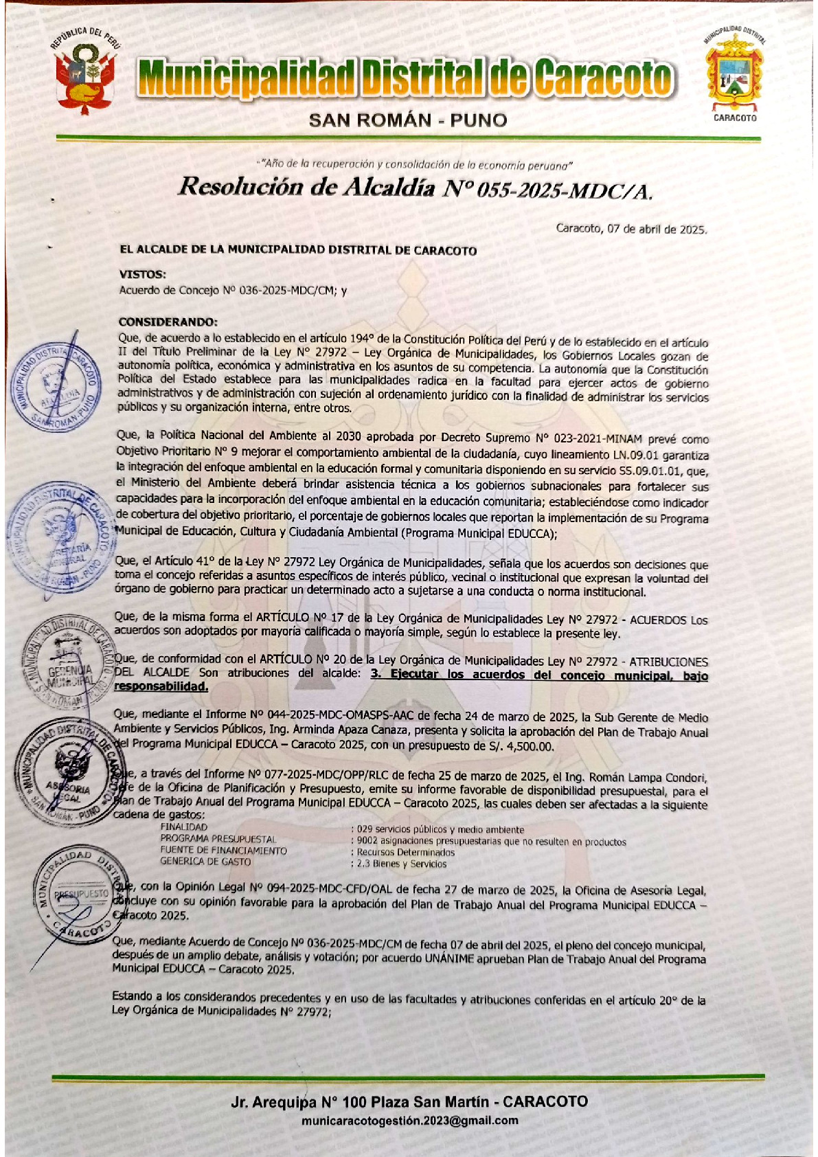 La presente Resolución de Alcaldía aprueba el Plan de Trabajo 2025 del Programa Municipal de Educación, Cultura y Ciudadanía Ambiental de la Municipalidad Distrital de Caracoto - San Román (Puno), con la finalidad de definir las actividades de educación, cultura y ciudadanía ambiental que se desarrollaran en la localidad durante el presente año.