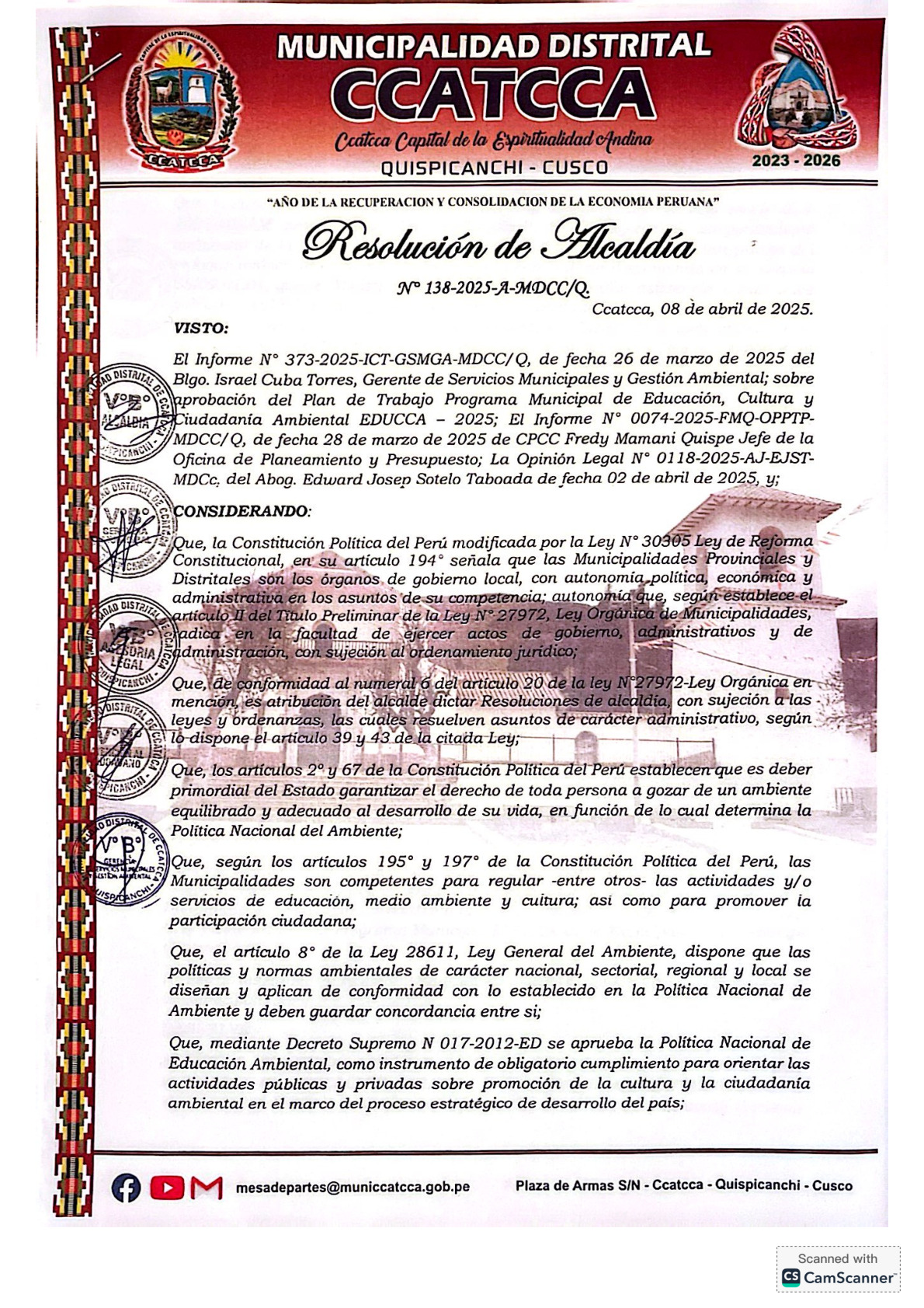 La presente Resolución de Alcaldía aprueba el Plan de Trabajo 2025 del Programa Municipal de Educación, Cultura y Ciudadanía Ambiental de la Municipalidad Distrital de Ccatacca -Quispicanchi (Cusco), con la finalidad de definir las actividades de educación, cultura y ciudadanía ambiental que se desarrollaran en la localidad durante el presente año.