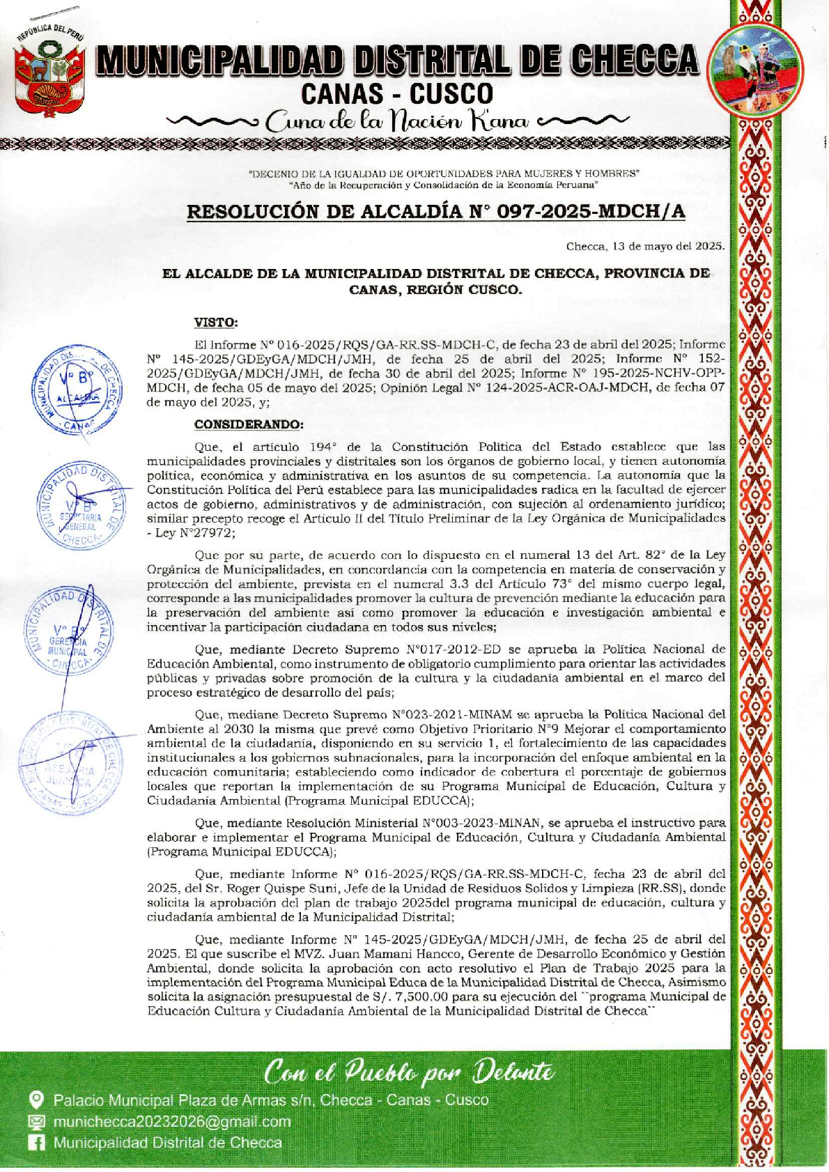La presente Resolución de Alcaldía aprueba el Plan de Trabajo 2025 del Programa Municipal de Educación, Cultura y Ciudadanía Ambiental de la Municipalidad Distrital de Checca - Canas (Cusco), con la finalidad de definir las actividades de educación, cultura y ciudadanía ambiental que se desarrollaran en la localidad durante el presente año.