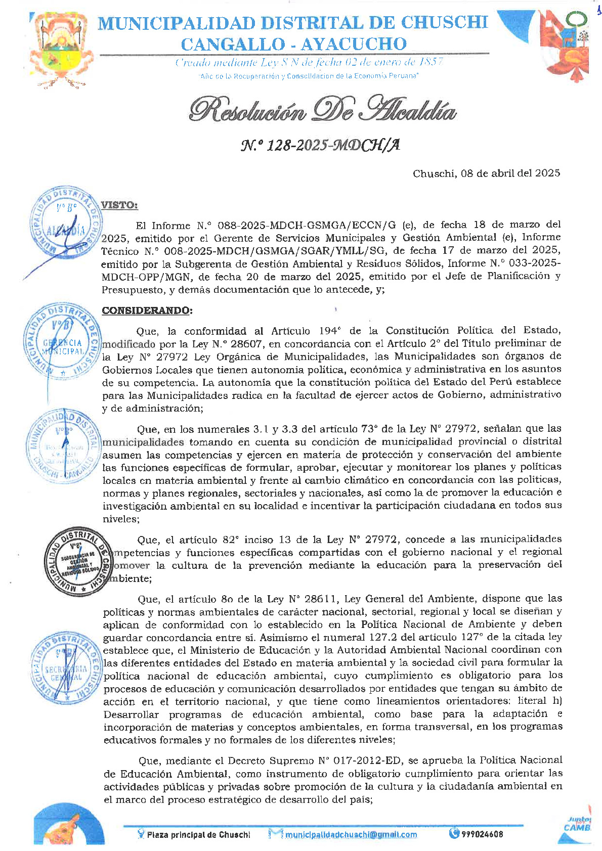 La presente Resolución de Alcaldía aprueba el Plan de Trabajo 2025 del Programa Municipal de Educación, Cultura y Ciudadanía Ambiental de la Municipalidad Distrital de Chuschi - Cangallo (Ayacucho), con la finalidad de definir las actividades de educación, cultura y ciudadanía ambiental que se desarrollaran en la localidad durante el presente año.