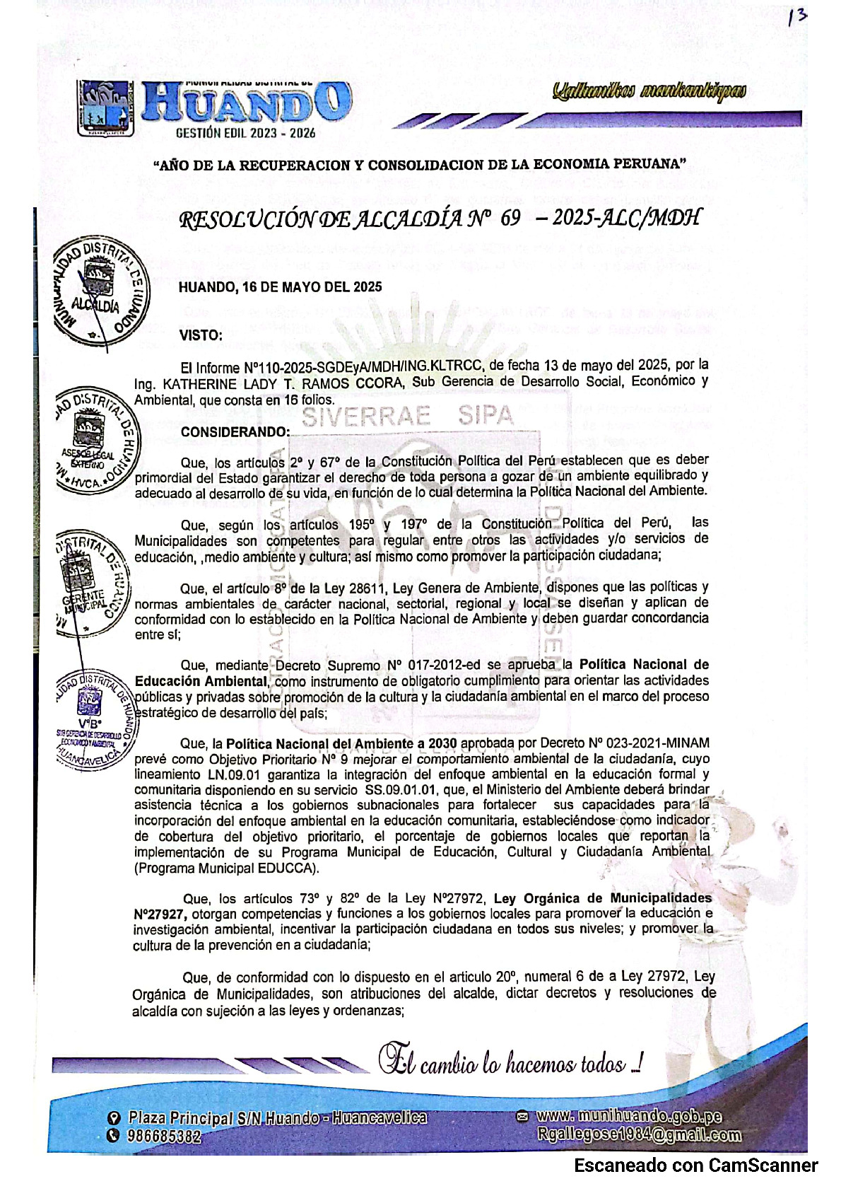 La presente Resolución de Alcaldía aprueba el Plan de Trabajo 2025 del Programa Municipal de Educación, Cultura y Ciudadanía Ambiental de la Municipalidad Distrital de Huando -Huancavelica (Huancavelica), con la finalidad de definir las actividades de educación, cultura y ciudadanía ambiental que se desarrollaran en la localidad durante el presente año.