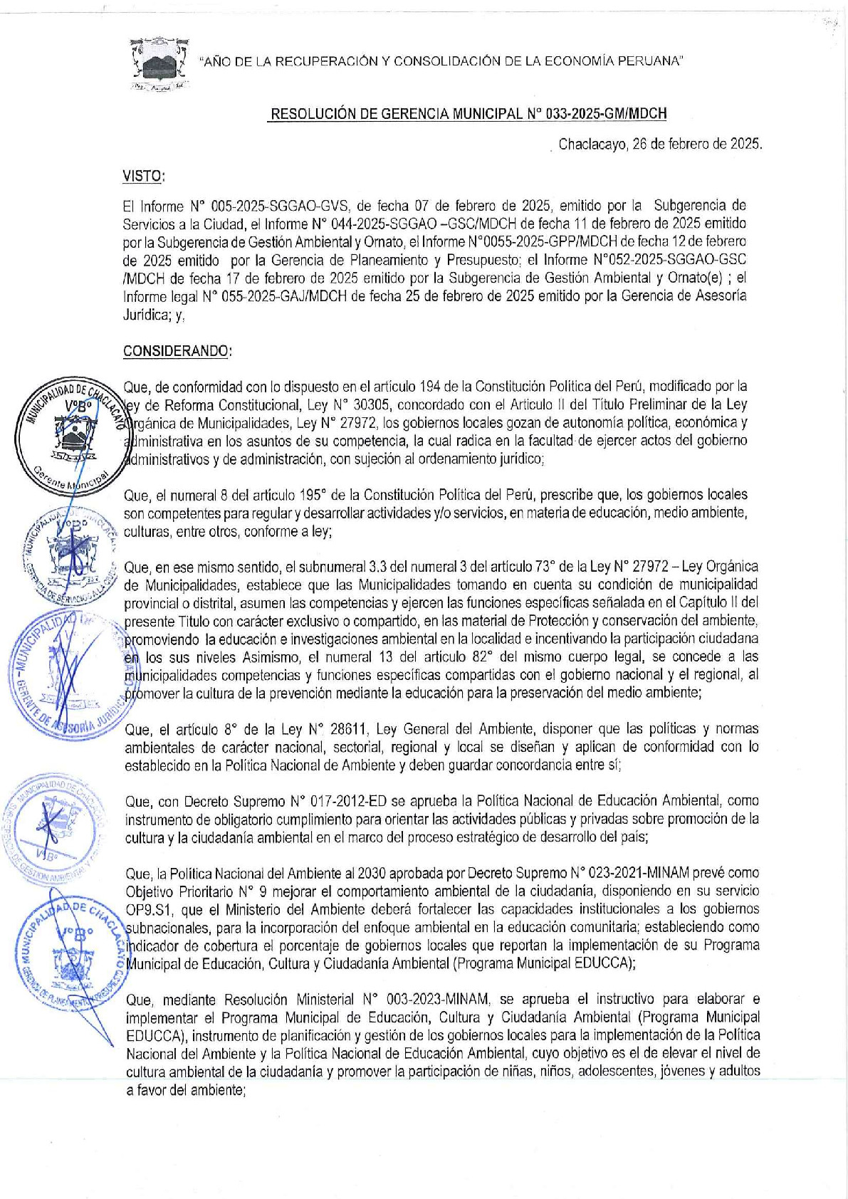 La presente Resolución de Gerencia Municipal aprueba el Plan de Trabajo 2025 del Programa Municipal de Educación, Cultura y Ciudadanía Ambiental de la Municipalidad Distrital de Chaclacayo (Lima Metropolitana), con la finalidad de definir las actividades de educación, cultura y ciudadanía ambiental que se desarrollaran en la localidad durante el presente año.