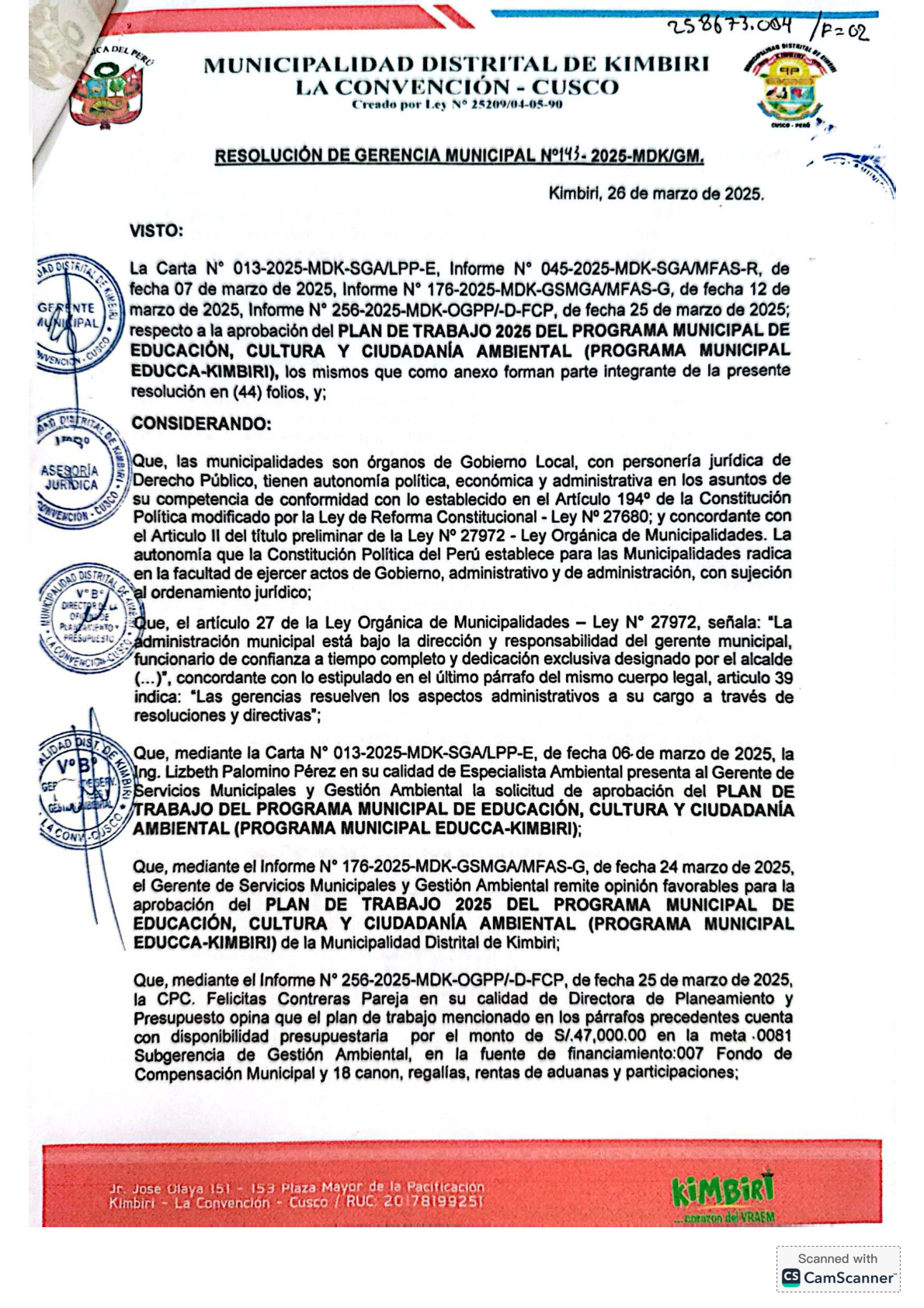 La presente Resolución de Gerencia Municipal aprueba el Plan de Trabajo 2025 del Programa Municipal de Educación, Cultura y Ciudadanía Ambiental de la Municipalidad Distrital de Kimbiri (Cusco), con la finalidad de definir las actividades de educación, cultura y ciudadanía ambiental que se desarrollaran en la localidad durante el presente año.