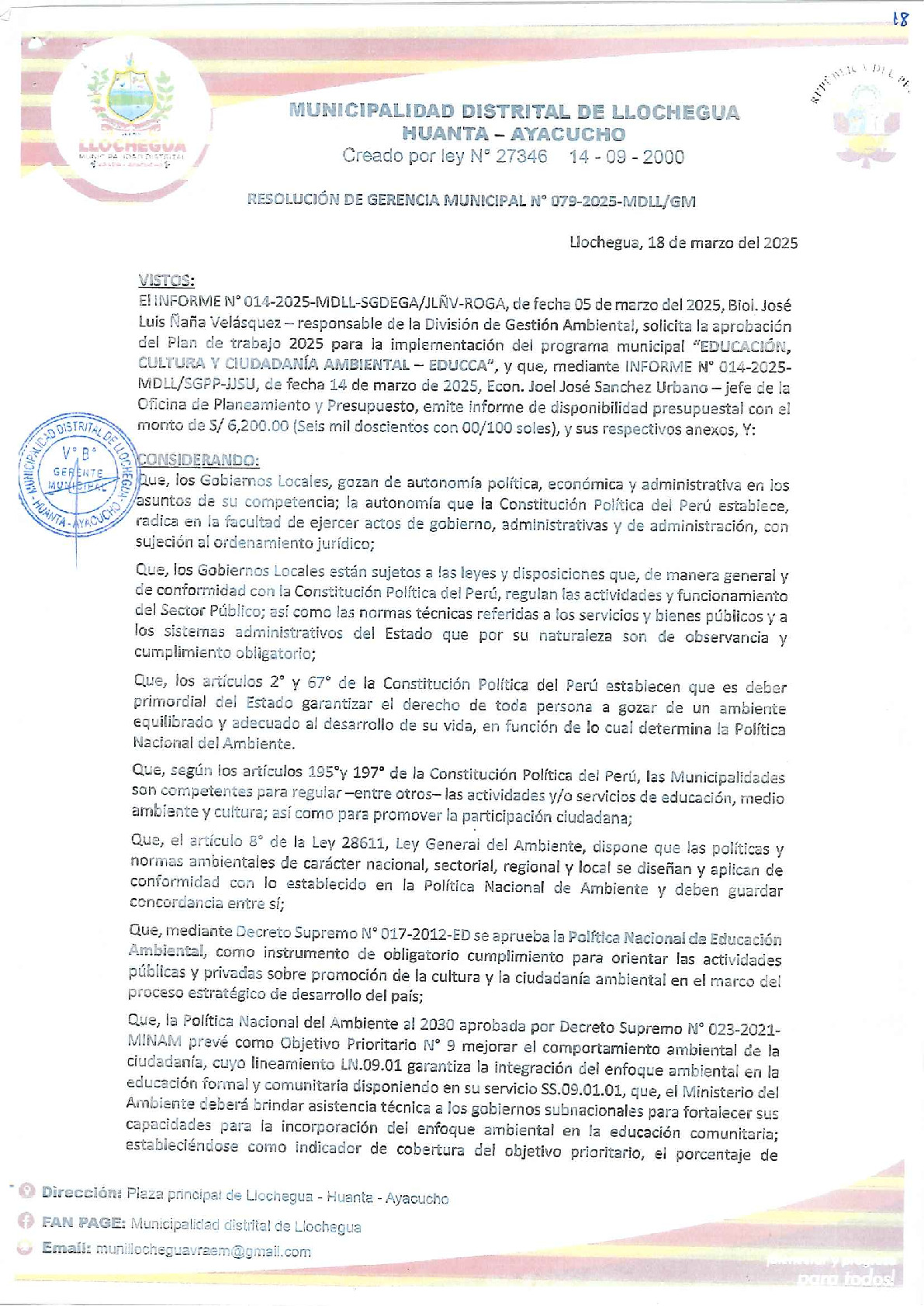 La presente Resolución de Gerencia Municipal aprueba el Plan de Trabajo 2025 del Programa Municipal de Educación, Cultura y Ciudadanía Ambiental de la Municipalidad Distrital de Llochegua (Ayacucho), con la finalidad de definir las actividades de educación, cultura y ciudadanía ambiental que se desarrollaran en la localidad durante el presente año.
