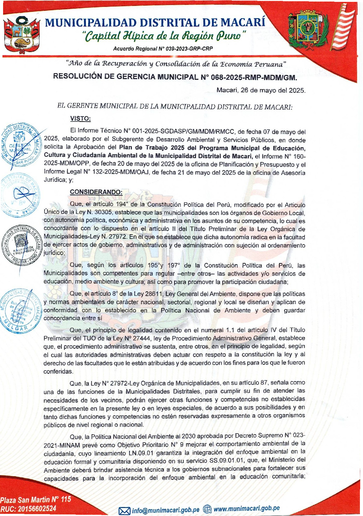 La presente Resolución de Gerencia Municipal aprueba el Plan de Trabajo 2025 del Programa Municipal de Educación, Cultura y Ciudadanía Ambiental de la Municipalidad Distrital de Macari (Puno), con la finalidad de definir las actividades de educación, cultura y ciudadanía ambiental que se desarrollaran en la localidad durante el presente año.