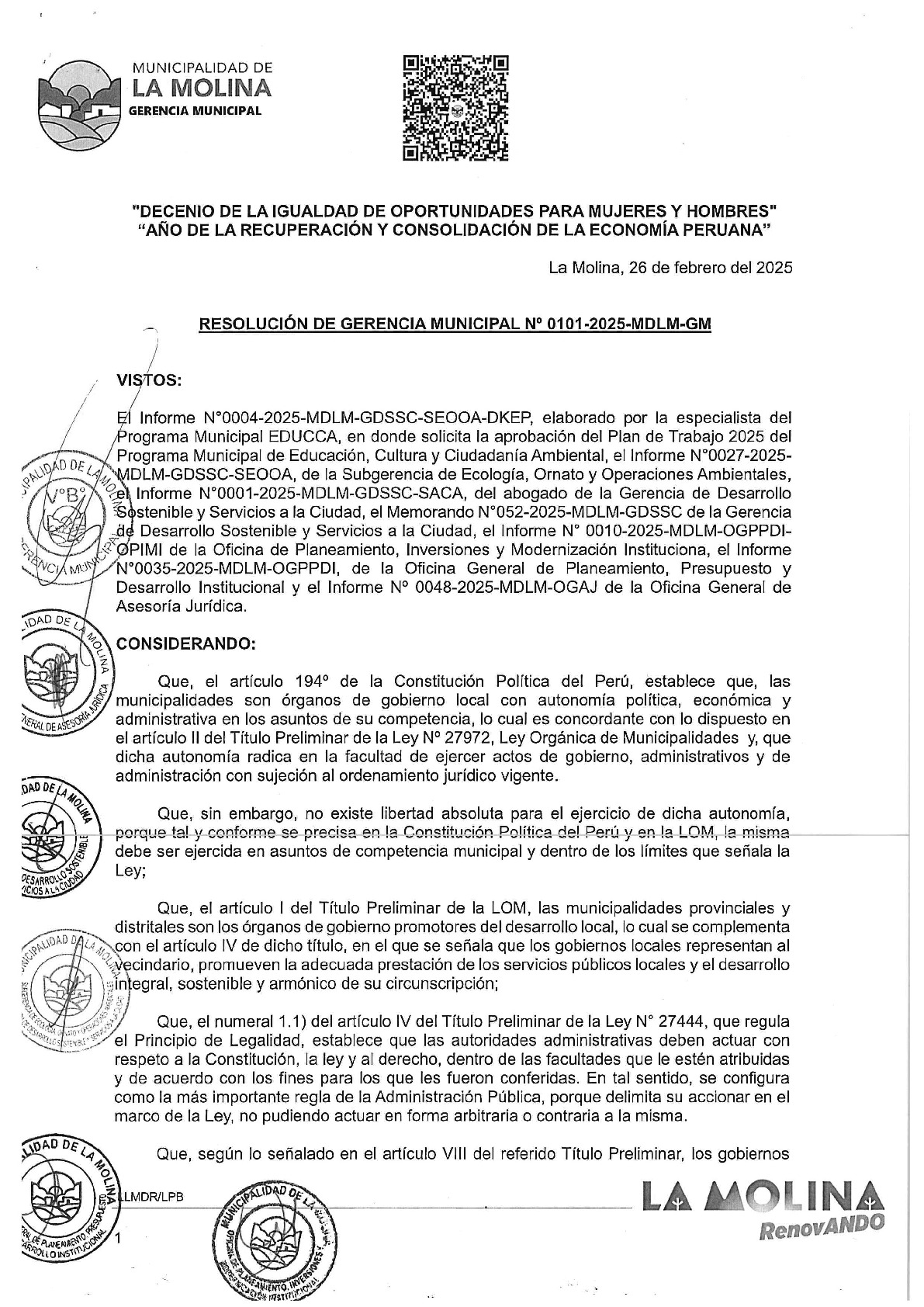 La presente Resolución de Gerencia Municipal aprueba el Plan de Trabajo 2025 del Programa Municipal de Educación, Cultura y Ciudadanía Ambiental de la Municipalidad Distrital de La Molina (Lima Metropolitana), con la finalidad de definir las actividades de educación, cultura y ciudadanía ambiental que se desarrollaran en la localidad durante el presente año.
