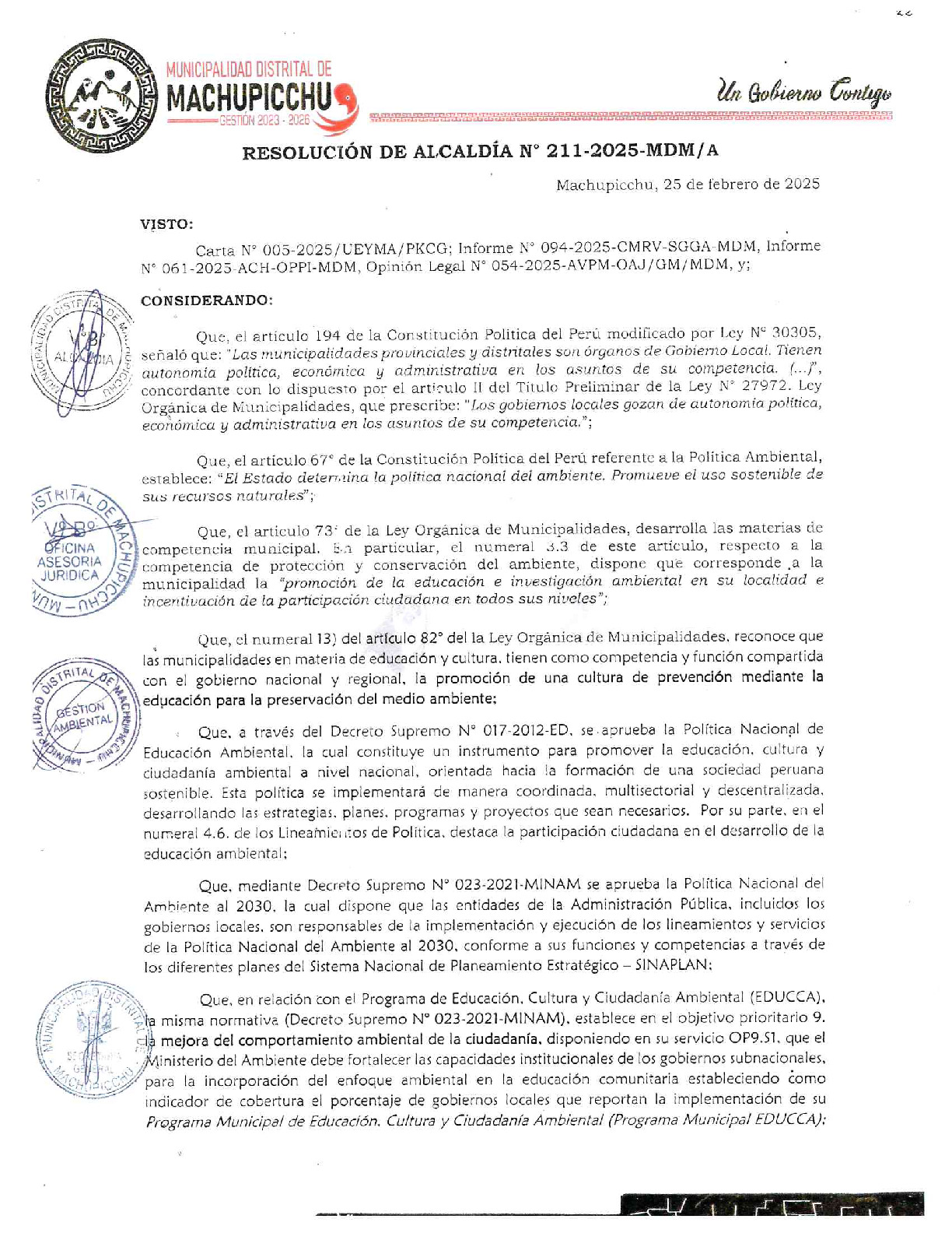 La presente Resolución de Alcaldía aprueba el Plan de Trabajo 2025 del Programa Municipal de Educación, Cultura y Ciudadanía Ambiental de la Municipalidad Distrital de Machupicchu - Urubamba (Cusco), con la finalidad de definir las actividades de educación, cultura y ciudadanía ambiental que se desarrollaran en la localidad durante el presente año.