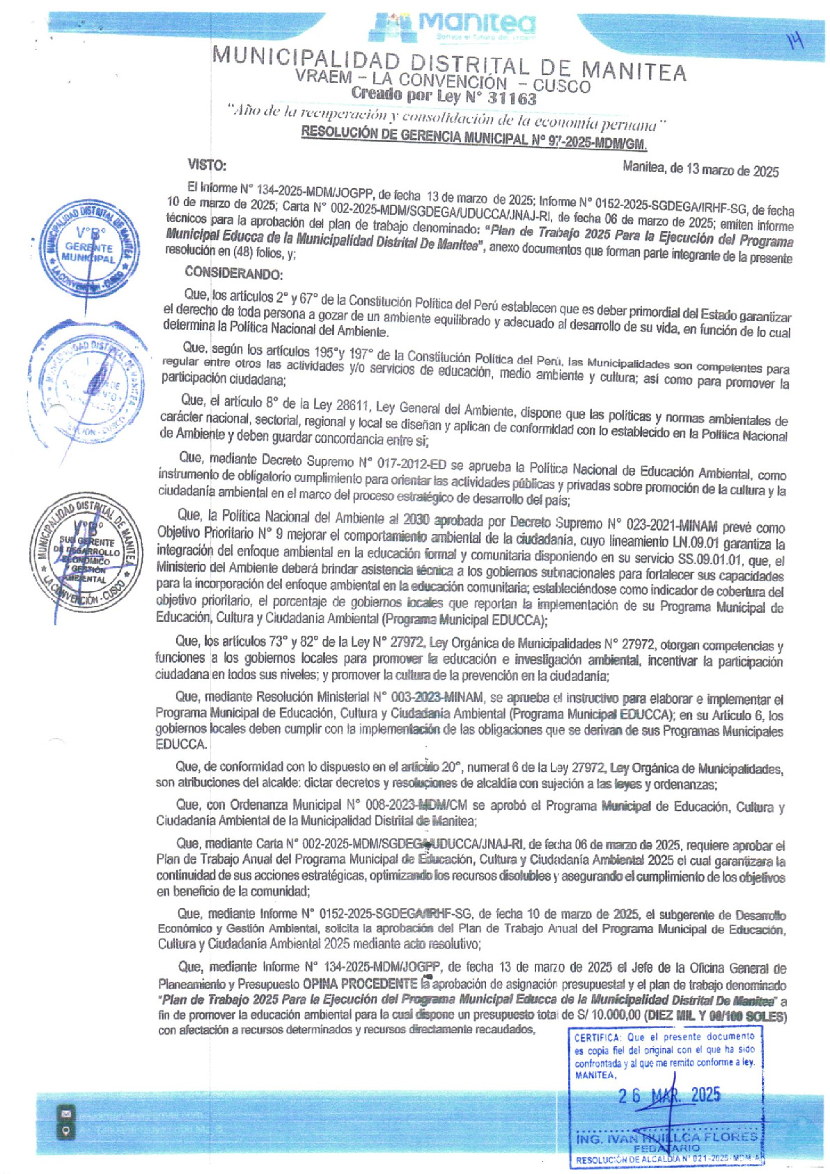 La presente Resolución de Gerencia Municipal aprueba el Plan de Trabajo 2025 del Programa Municipal de Educación, Cultura y Ciudadanía Ambiental de la Municipalidad Distrital de Manitea (Cusco), con la finalidad de definir las actividades de educación, cultura y ciudadanía ambiental que se desarrollaran en la localidad durante el presente año.