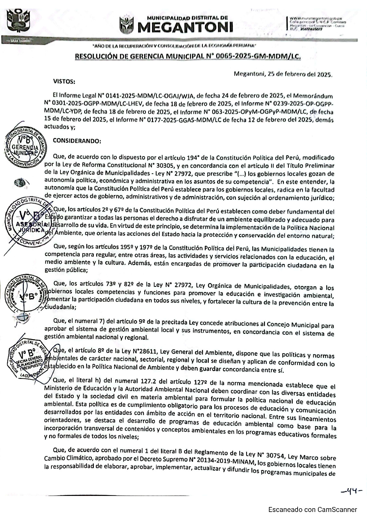 La presente Resolución de Gerencia Municipal aprueba el Plan de Trabajo 2025 del Programa Municipal de Educación, Cultura y Ciudadanía Ambiental de la Municipalidad Distrital de Megantoni (Cusco), con la finalidad de definir las actividades de educación, cultura y ciudadanía ambiental que se desarrollaran en la localidad durante el presente año.