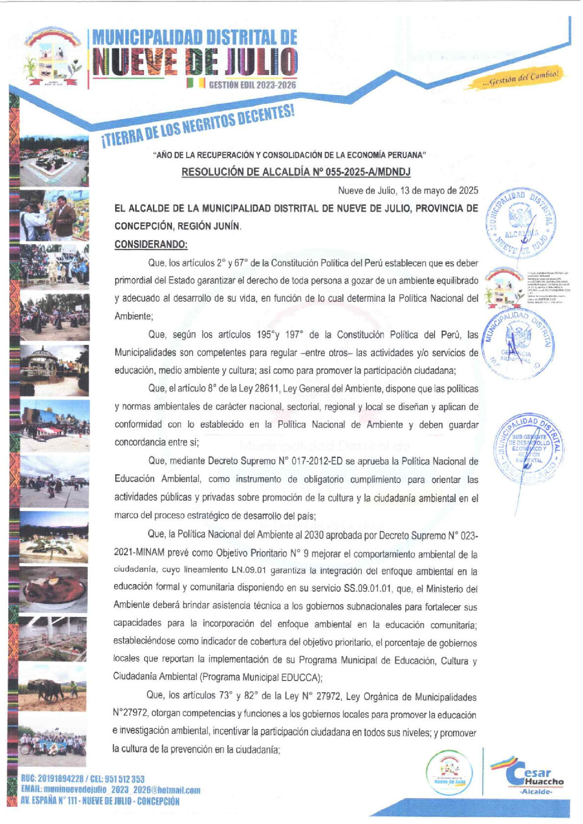 La presente Resolución de Alcaldía aprueba el Plan de Trabajo 2025 del Programa Municipal de Educación, Cultura y Ciudadanía Ambiental de la Municipalidad Distrital de Nueve de Julio - Concepción (Junín), con la finalidad de definir las actividades de educación, cultura y ciudadanía ambiental que se desarrollaran en la localidad durante el presente año.