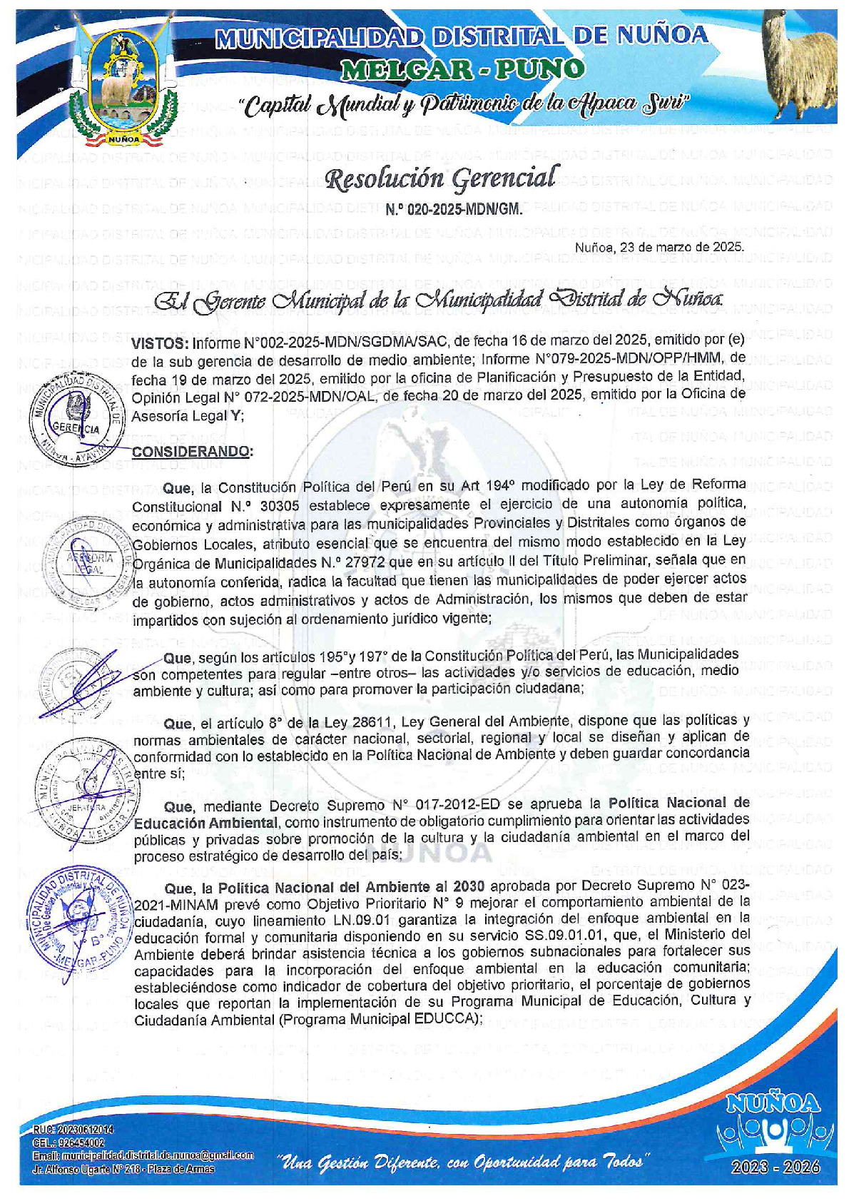 La presente Resolución de Gerencia Municipal aprueba el Plan de Trabajo 2025 del Programa Municipal de Educación, Cultura y Ciudadanía Ambiental de la Municipalidad Distrital de Nuñoa (Puno), con la finalidad de definir las actividades de educación, cultura y ciudadanía ambiental que se desarrollaran en la localidad durante el presente año.