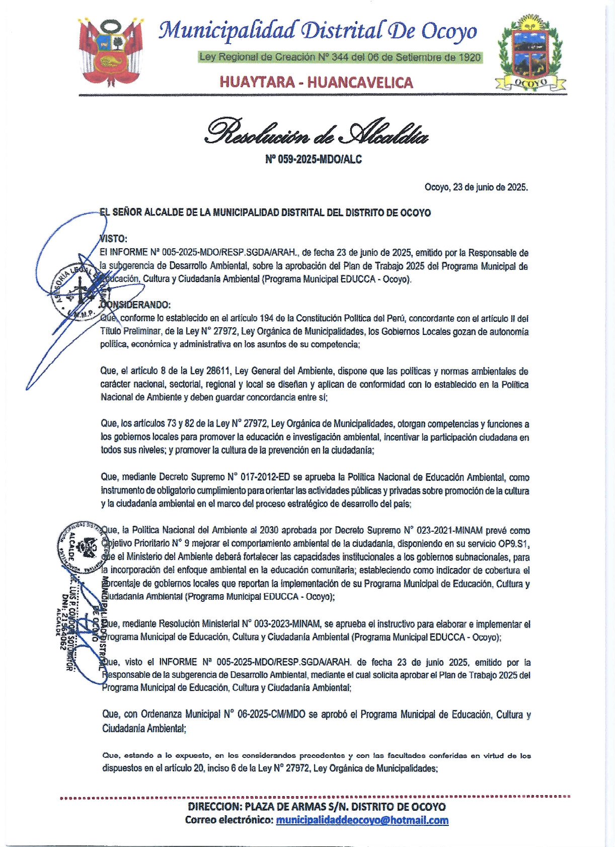 La presente Resolución de Alcaldía aprueba el Plan de Trabajo 2025 del Programa Municipal de Educación, Cultura y Ciudadanía Ambiental de la Municipalidad Distrital de Ocoyo -Huaytará (Huancavelica), con la finalidad de definir las actividades de educación, cultura y ciudadanía ambiental que se desarrollaran en la localidad durante el presente año.