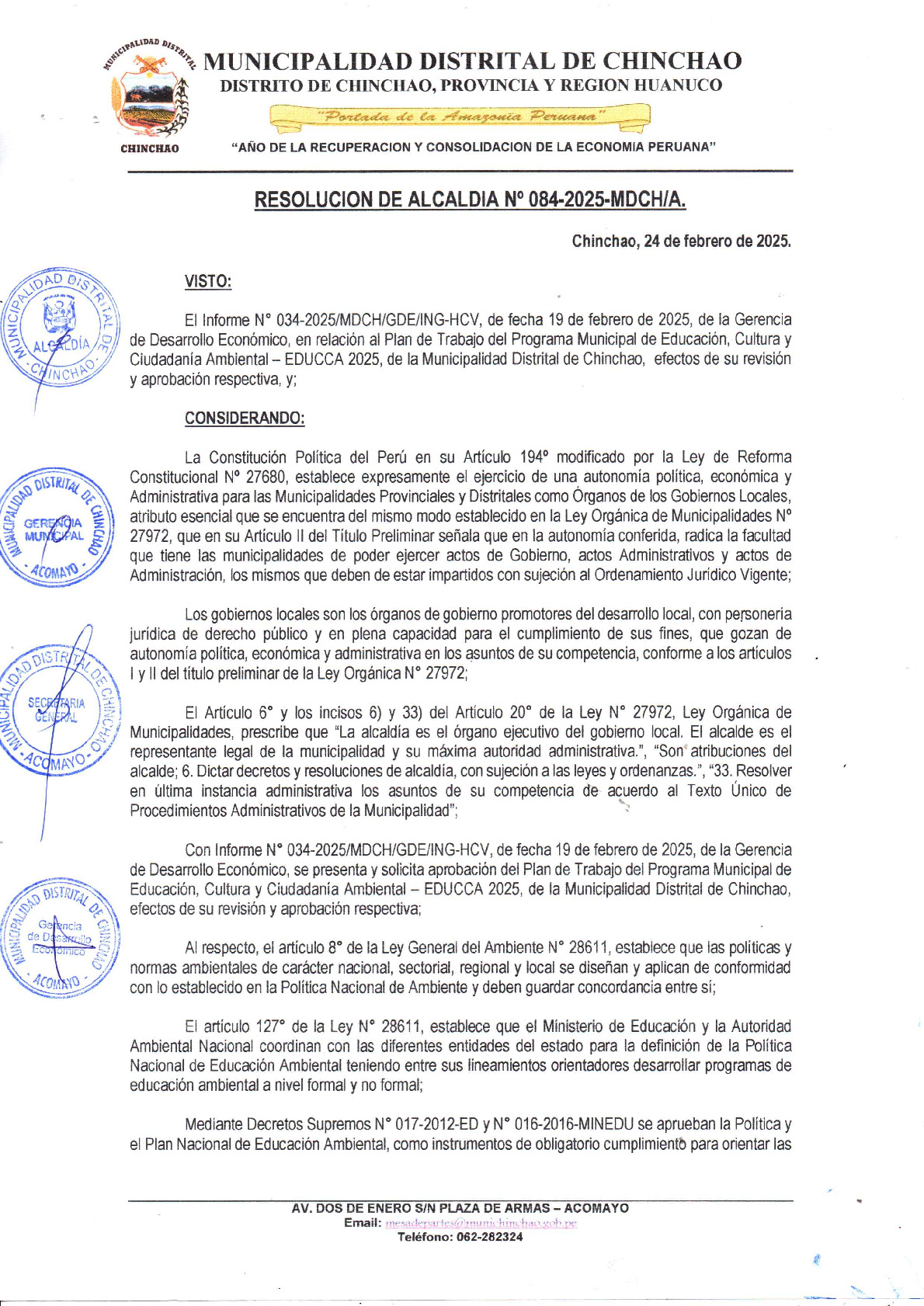 La presente Resolución de Alcaldía aprueba el Plan de Trabajo 2025 del Programa Municipal de Educación, Cultura y Ciudadanía Ambiental de la Municipalidad Distrital de Chinchao - Huánuco (Huánuco), con la finalidad de definir las actividades de educación, cultura y ciudadanía ambiental que se desarrollaran en la localidad durante el presente año.