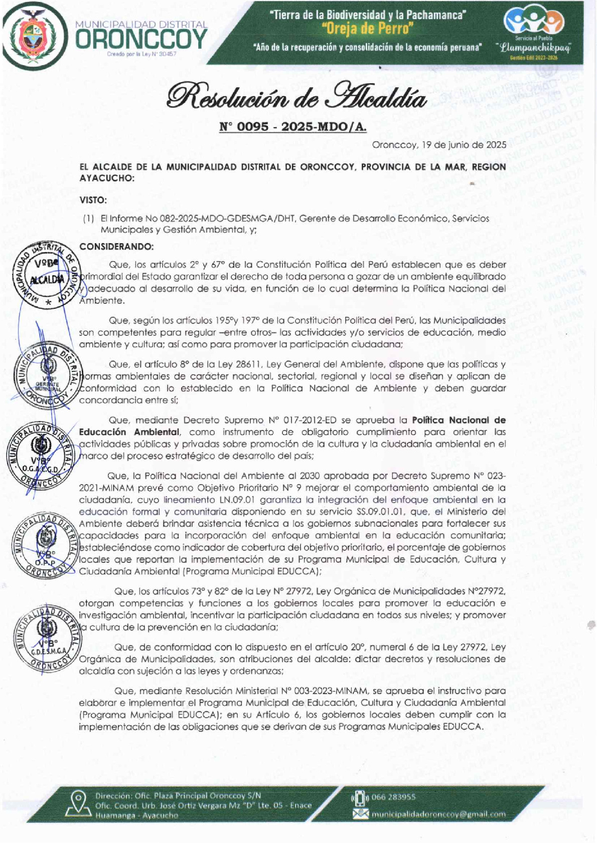 La presente Resolución de Alcaldía aprueba el Plan de Trabajo 2025 del Programa Municipal de Educación, Cultura y Ciudadanía Ambiental de la Municipalidad Distrital de Oronccoy -La Mar (Ayacucho), con la finalidad de definir las actividades de educación, cultura y ciudadanía ambiental que se desarrollaran en la localidad durante el presente año.
