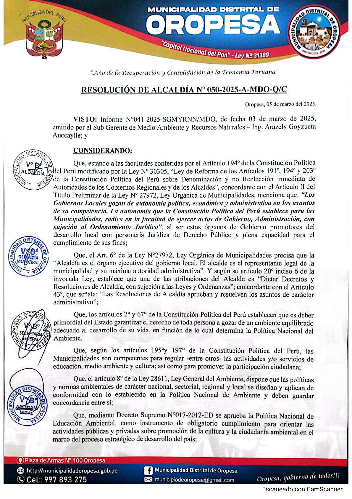 La presente Resolución de Alcaldía aprueba el Plan de Trabajo 2025 del Programa Municipal de Educación, Cultura y Ciudadanía Ambiental de la Municipalidad Distrital de Oropesa -Antabamba (Apurímac), con la finalidad de definir las actividades de educación, cultura y ciudadanía ambiental que se desarrollaran en la localidad durante el presente año.