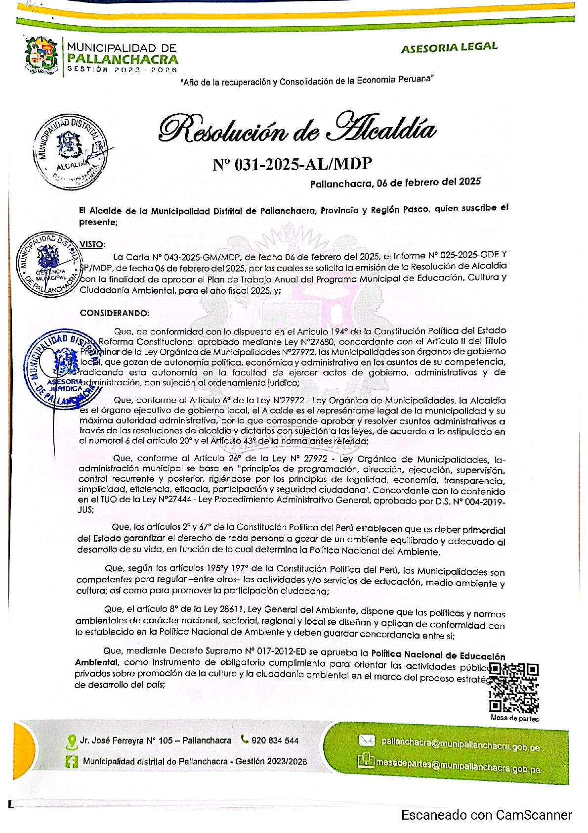 La presente Resolución de Alcaldía aprueba el Plan de Trabajo 2025 del Programa Municipal de Educación, Cultura y Ciudadanía Ambiental de la Municipalidad Distrital de Pallanchacra - Pasco (Pasco), con la finalidad de definir las actividades de educación, cultura y ciudadanía ambiental que se desarrollaran en la localidad durante el presente año.