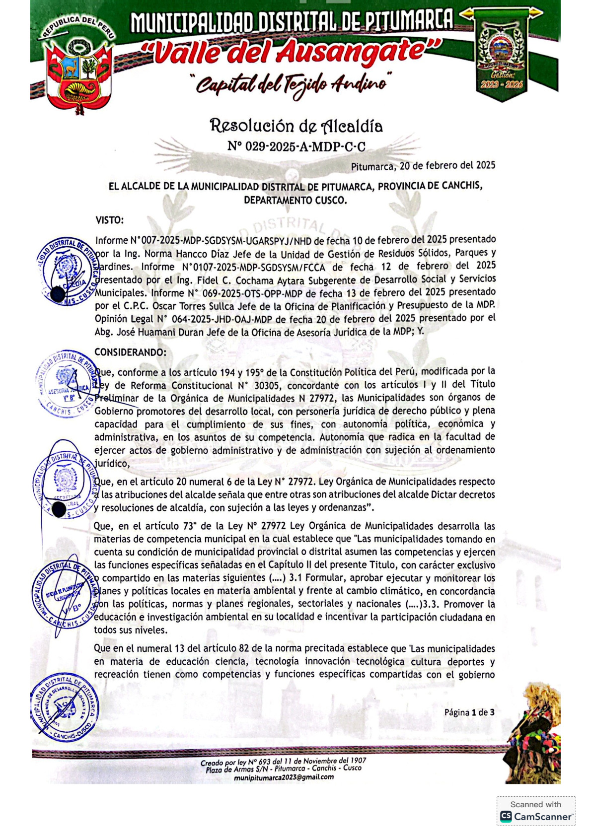 La presente Resolución de Alcaldía aprueba el Plan de Trabajo 2025 del Programa Municipal de Educación, Cultura y Ciudadanía Ambiental de la Municipalidad Distrital de Pitumarca -Canchis (Cusco), con la finalidad de definir las actividades de educación, cultura y ciudadanía ambiental que se desarrollaran en la localidad durante el presente año.