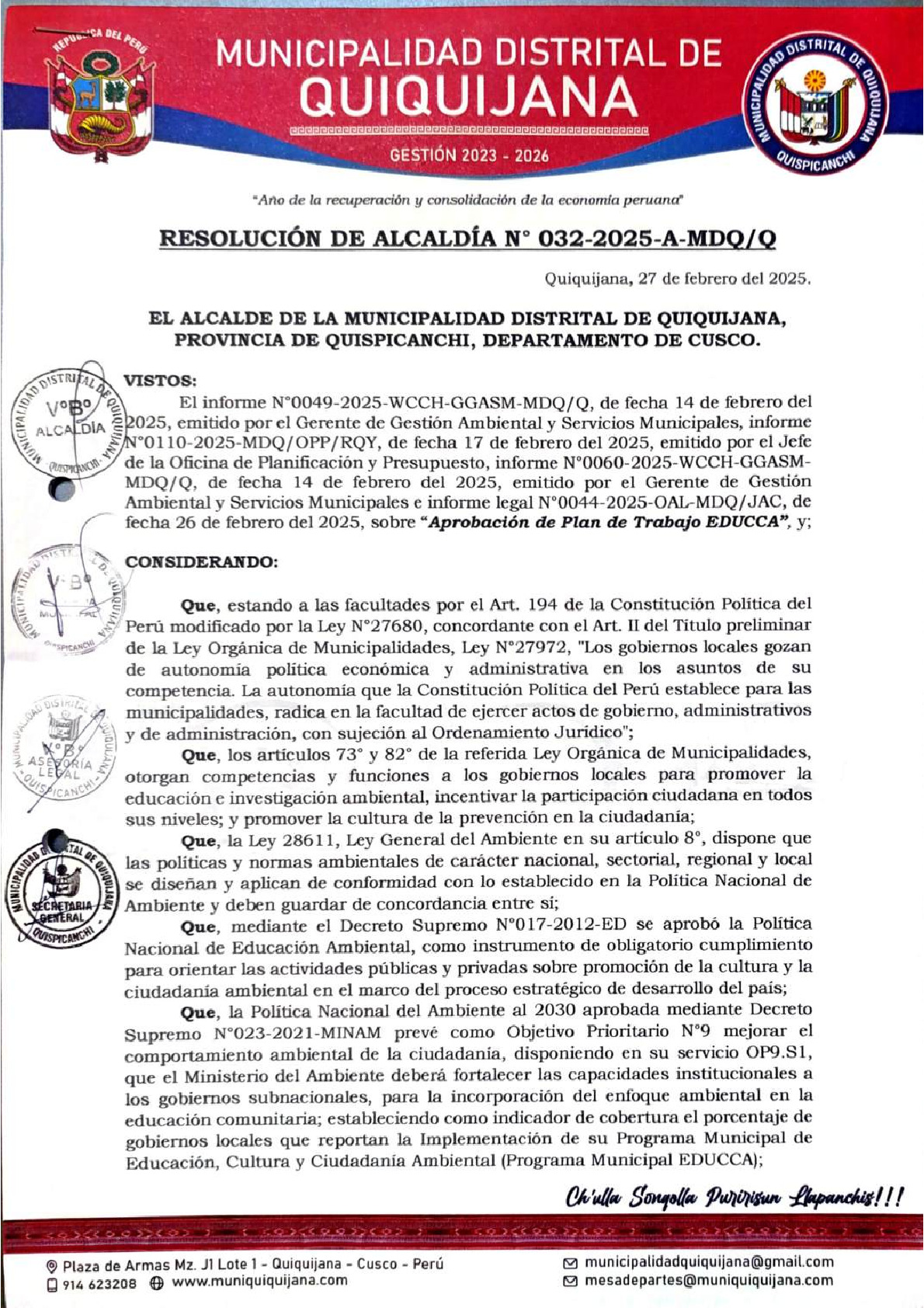 La presente Resolución de Alcaldía aprueba el Plan de Trabajo 2025 del Programa Municipal de Educación, Cultura y Ciudadanía Ambiental de la Municipalidad Distrital de Quiquijana -Quispicanchi (Cusco), con la finalidad de definir las actividades de educación, cultura y ciudadanía ambiental que se desarrollaran en la localidad durante el presente año.