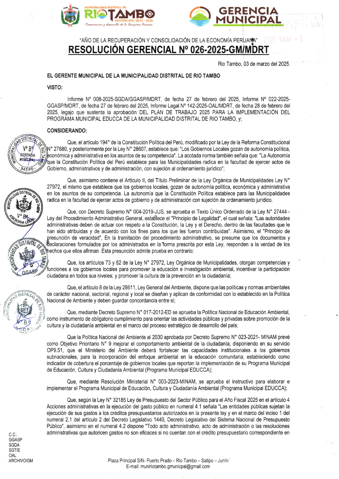 La presente Resolución de Gerencia Municipal aprueba el Plan de Trabajo 2025 del Programa Municipal de Educación, Cultura y Ciudadanía Ambiental de la Municipalidad Distrital de Río Tambo (Junín), con la finalidad de definir las actividades de educación, cultura y ciudadanía ambiental que se desarrollaran en la localidad durante el presente año.