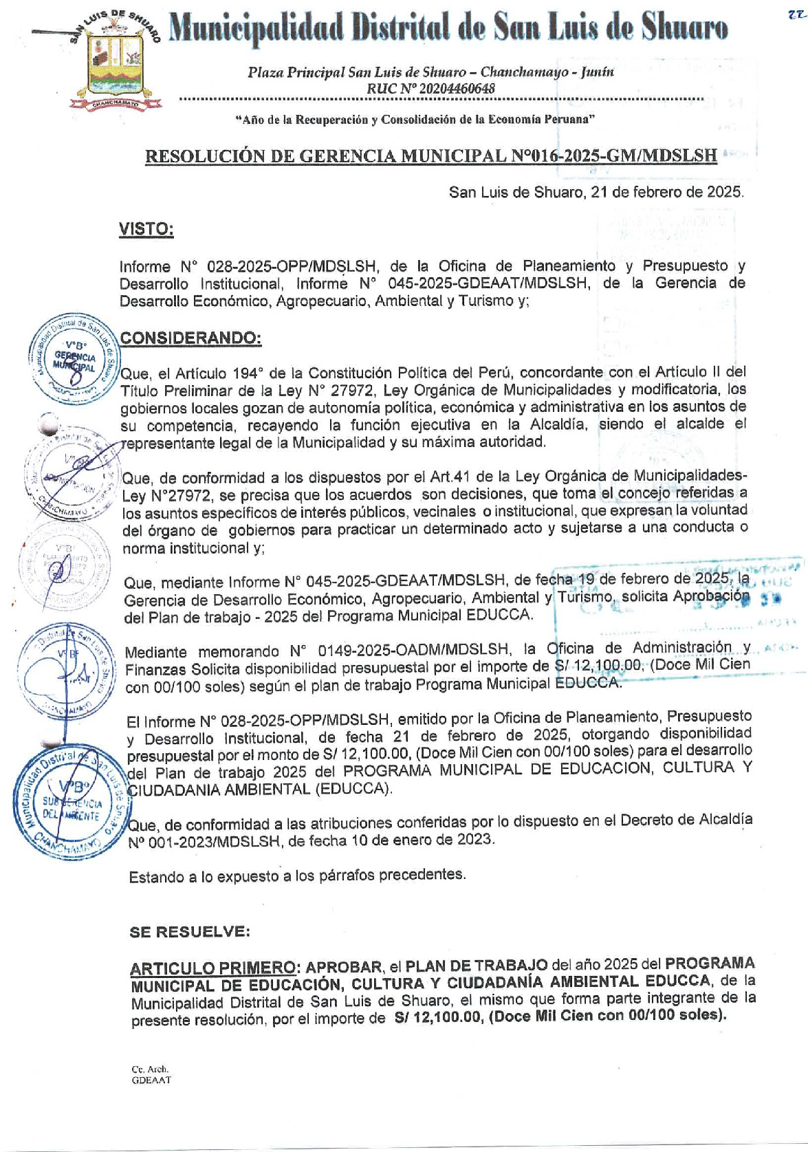 La presente Resolución de Gerencia Municipal aprueba el Plan de Trabajo 2025 del Programa Municipal de Educación, Cultura y Ciudadanía Ambiental de la Municipalidad Distrital de San Luis de Shuaro (Junín), con la finalidad de definir las actividades de educación, cultura y ciudadanía ambiental que se desarrollaran en la localidad durante el presente año.