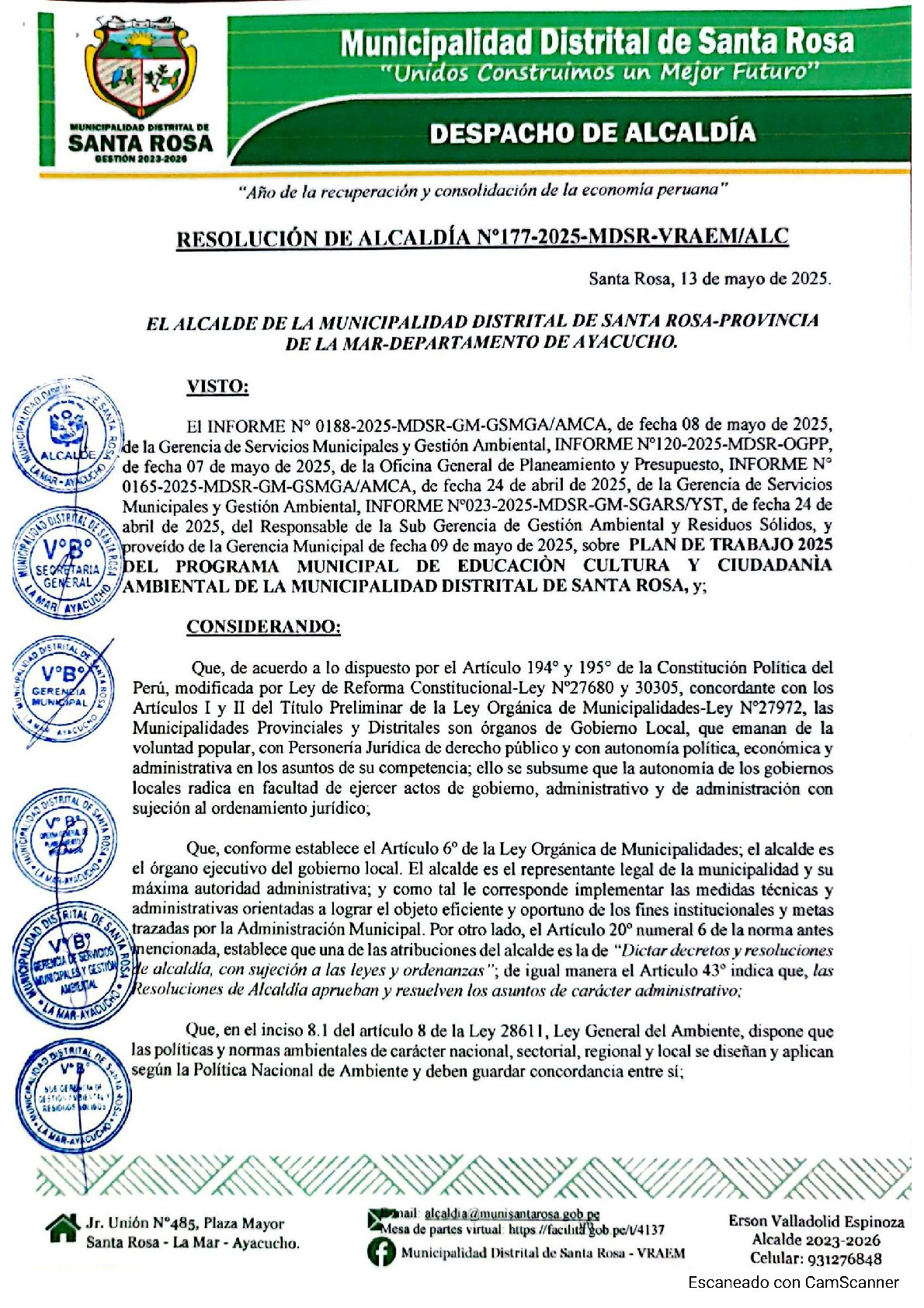 La presente Resolución de Alcaldía aprueba el Plan de Trabajo 2025 del Programa Municipal de Educación, Cultura y Ciudadanía Ambiental de la Municipalidad Distrital de Santa Rosa -La Mar (Ayacucho), con la finalidad de definir las actividades de educación, cultura y ciudadanía ambiental que se desarrollaran en la localidad durante el presente año.