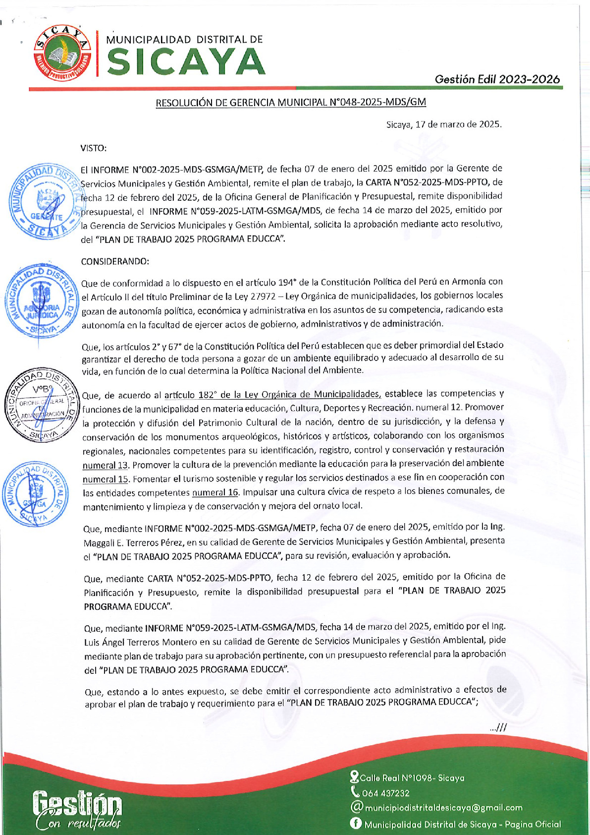 La presente Resolución de Gerencia Municipal aprueba el Plan de Trabajo 2025 del Programa Municipal de Educación, Cultura y Ciudadanía Ambiental de la Municipalidad Distrital de Sicaya (Junín), con la finalidad de definir las actividades de educación, cultura y ciudadanía ambiental que se desarrollaran en la localidad durante el presente año.