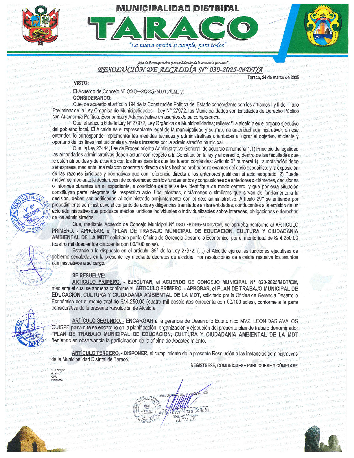 La presente Resolución de Alcaldía aprueba el Plan de Trabajo 2025 del Programa Municipal de Educación, Cultura y Ciudadanía Ambiental de la Municipalidad Distrital de Taraco -Huancané (Puno), con la finalidad de definir las actividades de educación, cultura y ciudadanía ambiental que se desarrollaran en la localidad durante el presente año.