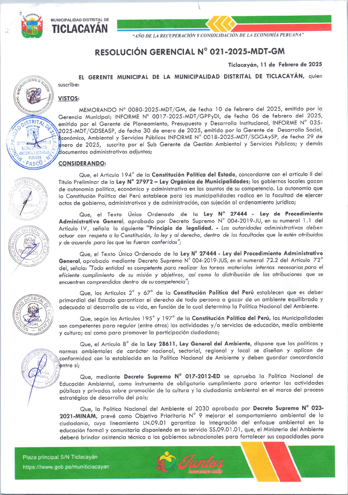 La presente Resolución de Gerencia Municipal aprueba el Plan de Trabajo 2025 del Programa Municipal de Educación, Cultura y Ciudadanía Ambiental de la Municipalidad Distrital de Ticlacayán (Pasco), con la finalidad de definir las actividades de educación, cultura y ciudadanía ambiental que se desarrollaran en la localidad durante el presente año.