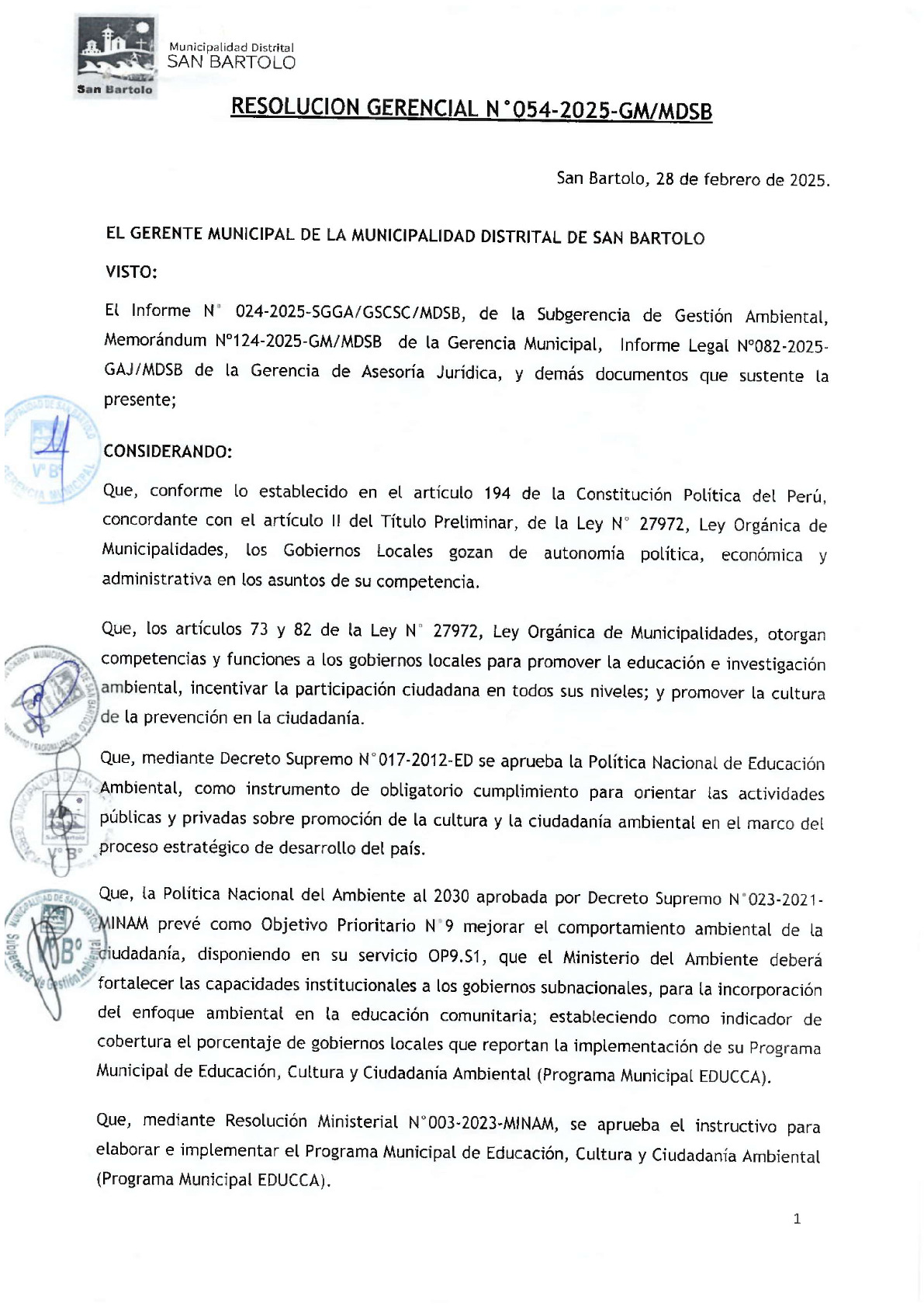 La presente Resolución de Gerencia Municipal aprueba el Plan de Trabajo 2025 del Programa Municipal de Educación, Cultura y Ciudadanía Ambiental de la Municipalidad Distrital de San Bartolo (Lima Metropolitana), con la finalidad de definir las actividades de educación, cultura y ciudadanía ambiental que se desarrollaran en la localidad durante el presente año.