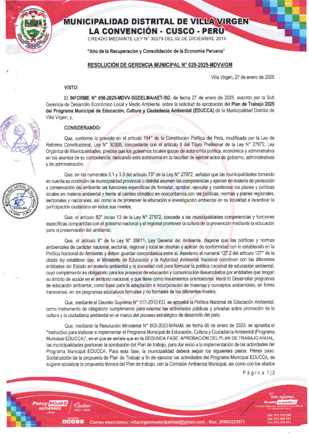Plan de Trabajo 2025 del Programa Municipal EDUCCA - Municipalidad Distrital de Villa Virgen